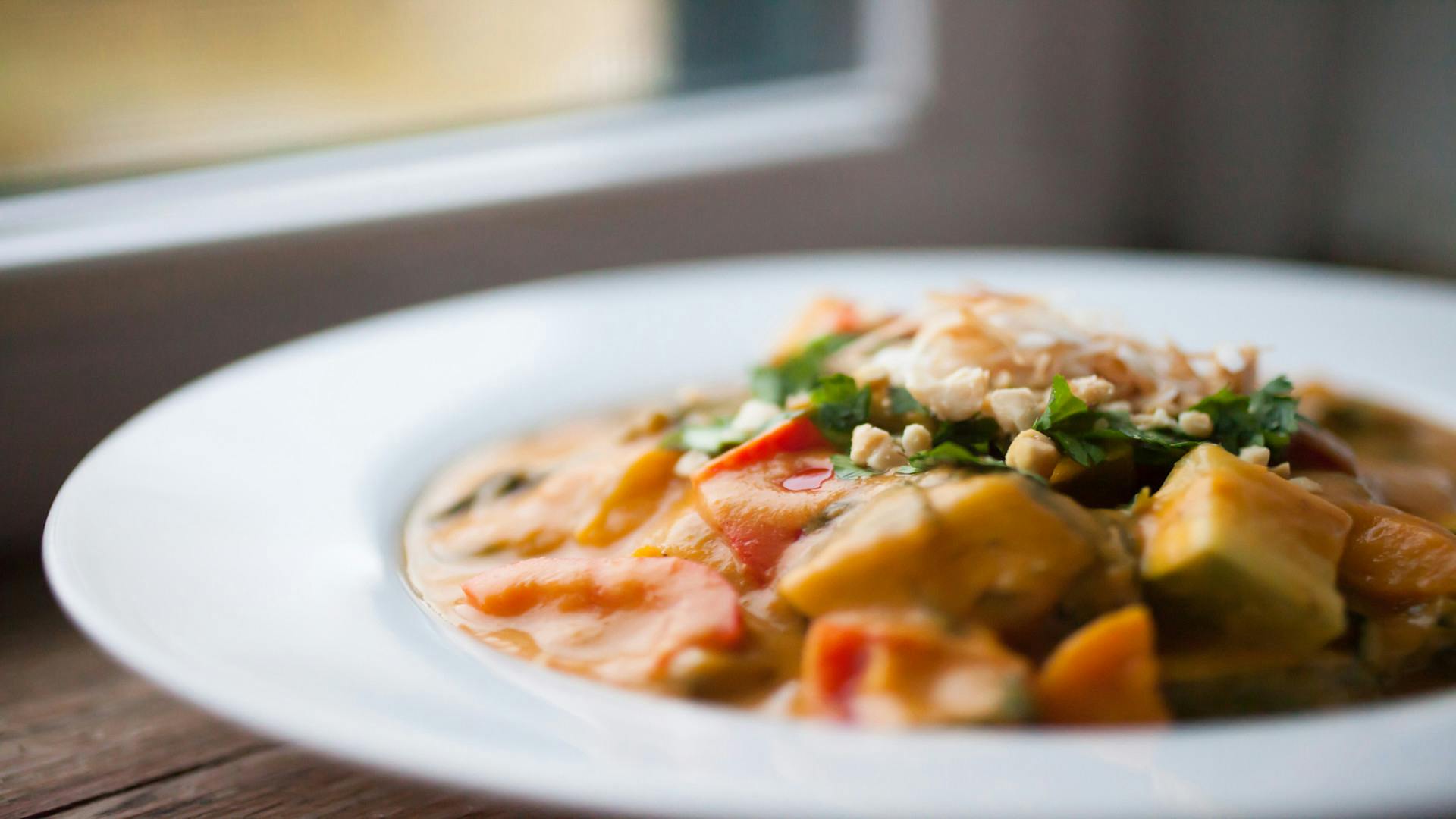 Adjust seasonings and ladle the curry into bowls, topping each serving with a sprinkle of coconut, cilantro, and peanuts.