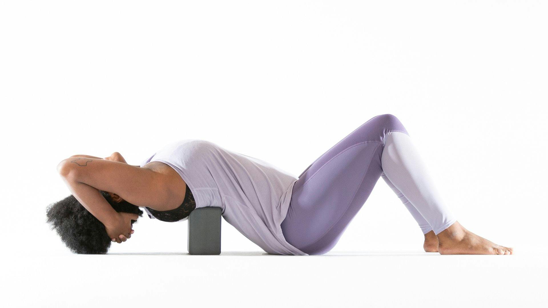 Bring your legs out in front of you, knees bent up toward the ceiling and feet on the floor at least hip width apart. Set your block behind you on its middle height, its long edge parallel to the short edge of your mat. Then recline back, positioning yourself so that the top edge of the block is just below the bottom of your shoulder blades. Bend your elbows, bringing your hands behind the back of your head to support its weight, and firm your abdominal muscles to support your lumbar spine.