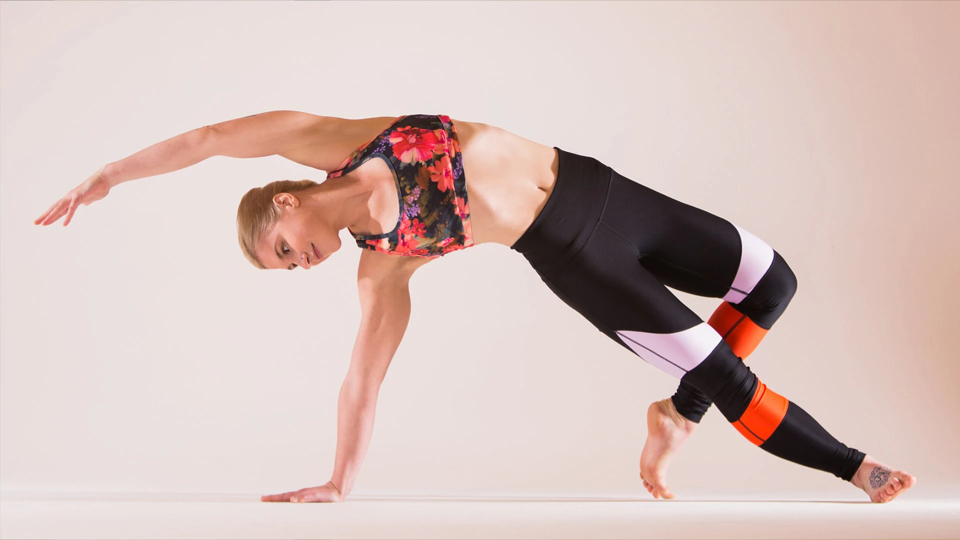 This strength-building side plank variation provides an extra challenge for your obliques and is an excellent preparatory pose for arm balances like visvamitrasana and eka pada bakasana (one-legged crow pose). It’s kind of like side angle pose, but with the bottom foot hovering off the ground (hence the name) and the heel squeezing in toward the sit bone.