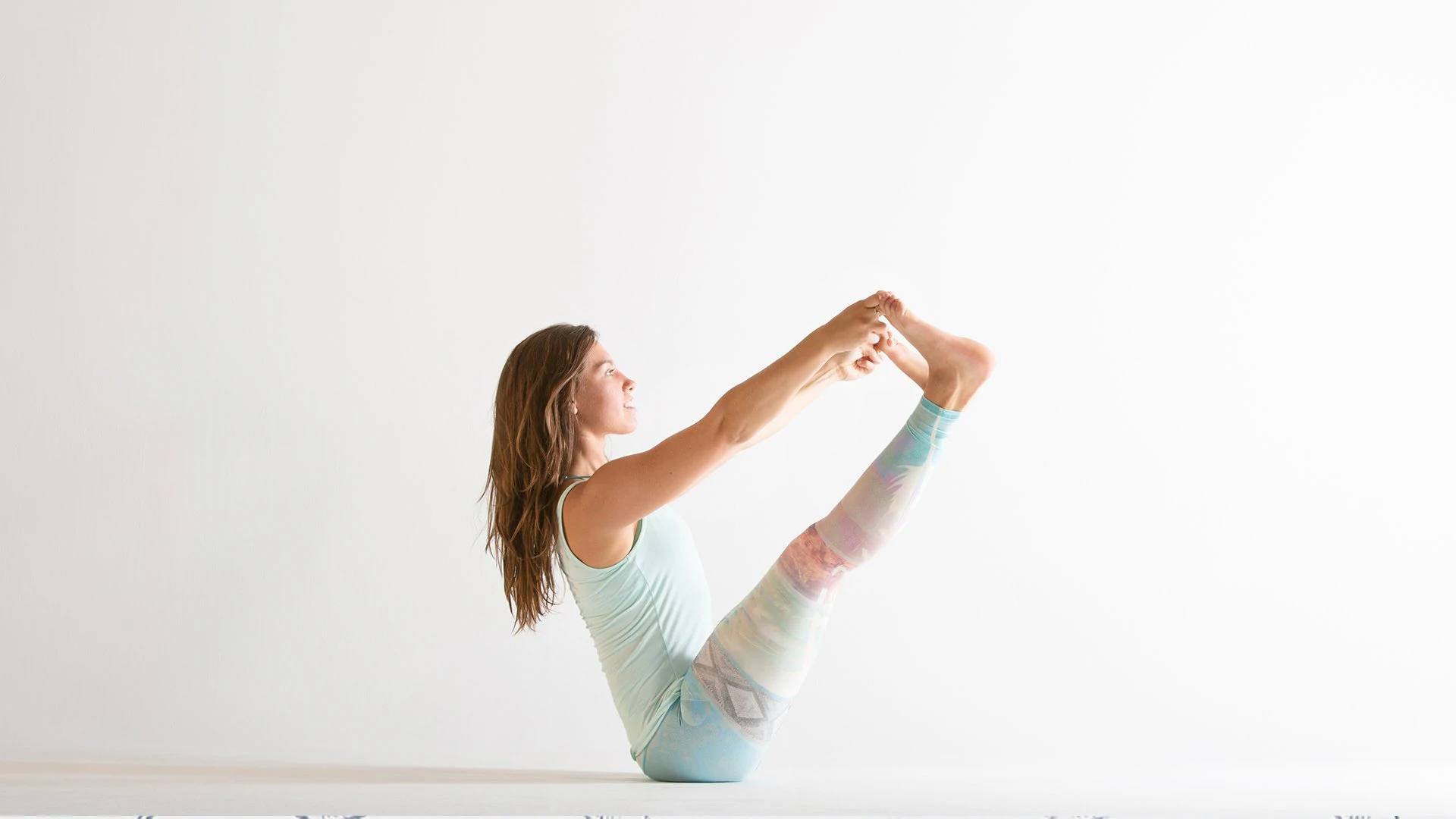 Come back to an upright, parallel-shin boat pose. Separate your legs so that you can reach your arms between and either grab hold of the outsides of your ankles, or bind your big toes. Balance on your sit-bones, and sit tall. You can keep knees bent, or extend your legs toward straight, but continue to lengthen through your spine. Inhale to stay, then, on an exhale, draw your belly back, round your spine, and rock back onto your shoulder blades (but not your neck or head) Inhale, rock back up to seated—see if you can put on the breaks and balance (yes, really!), lengthening through your spine. Exhale, round and rock back again. Try 5-10 rounds. Challenge a friend to rock and roll with you! Are your abs sore because you're movement is so slow and controlled, or because you're laughing super-hard? No one knows for certain.