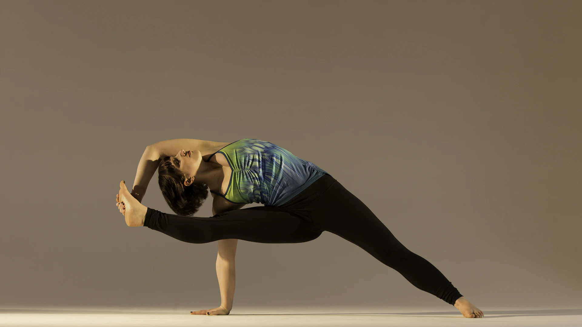 This variation looks similar to the classic visvamitrasana, although it does not require working the shoulder over the leg—making it more accessible for those who feel restricted by tight hips, or who struggle to balance in the pose. For me, working with this variation gave me my very first inkling that visvamitrasana might not be as impossible as I'd thought.