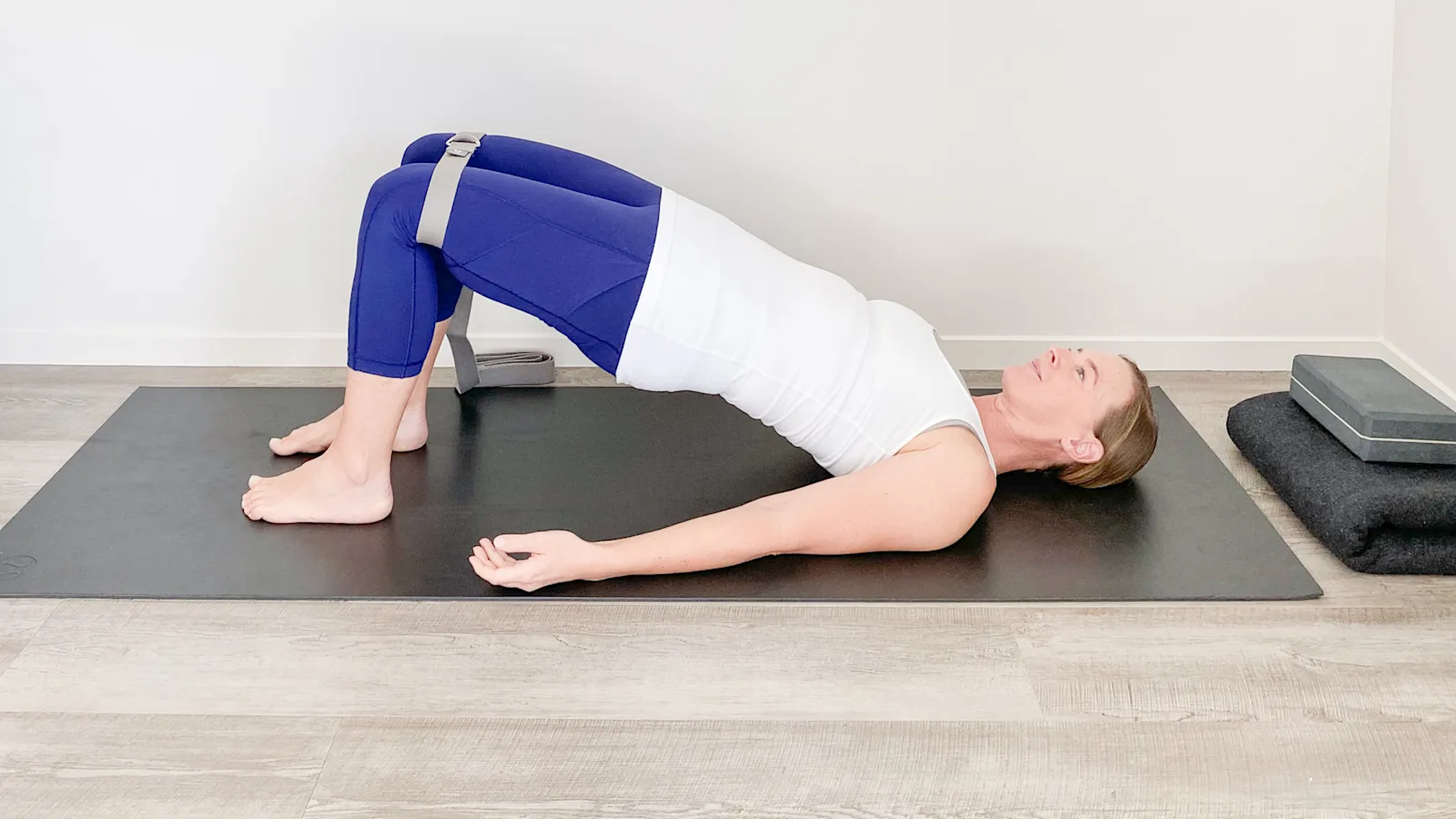 Keep the strap taut as you lift your hips into bridge pose, and hold there for five breaths. Observe exactly how the muscle activation feels: Are you able to maintain strong and continuous engagement? Can you hold your hips steady without strain?