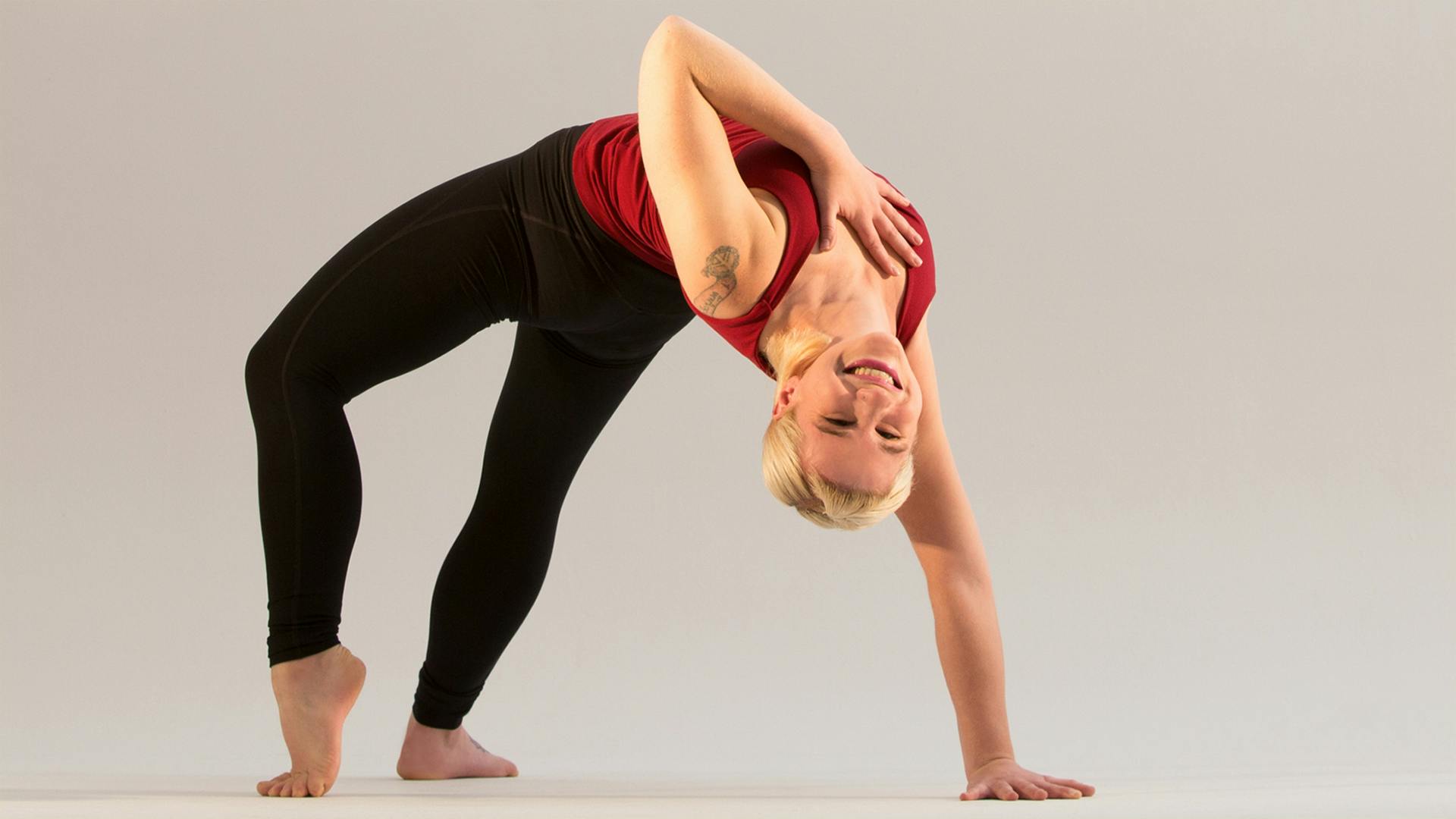 If you feel stable, you can try bringing a hand to your heart in poses such as natarajasana (dancer pose), ustrasana (camel pose), urdhva dhanurasana (upward facing bow or “wheel” pose), and camatkarasana (wild thing, or “flip dog”).