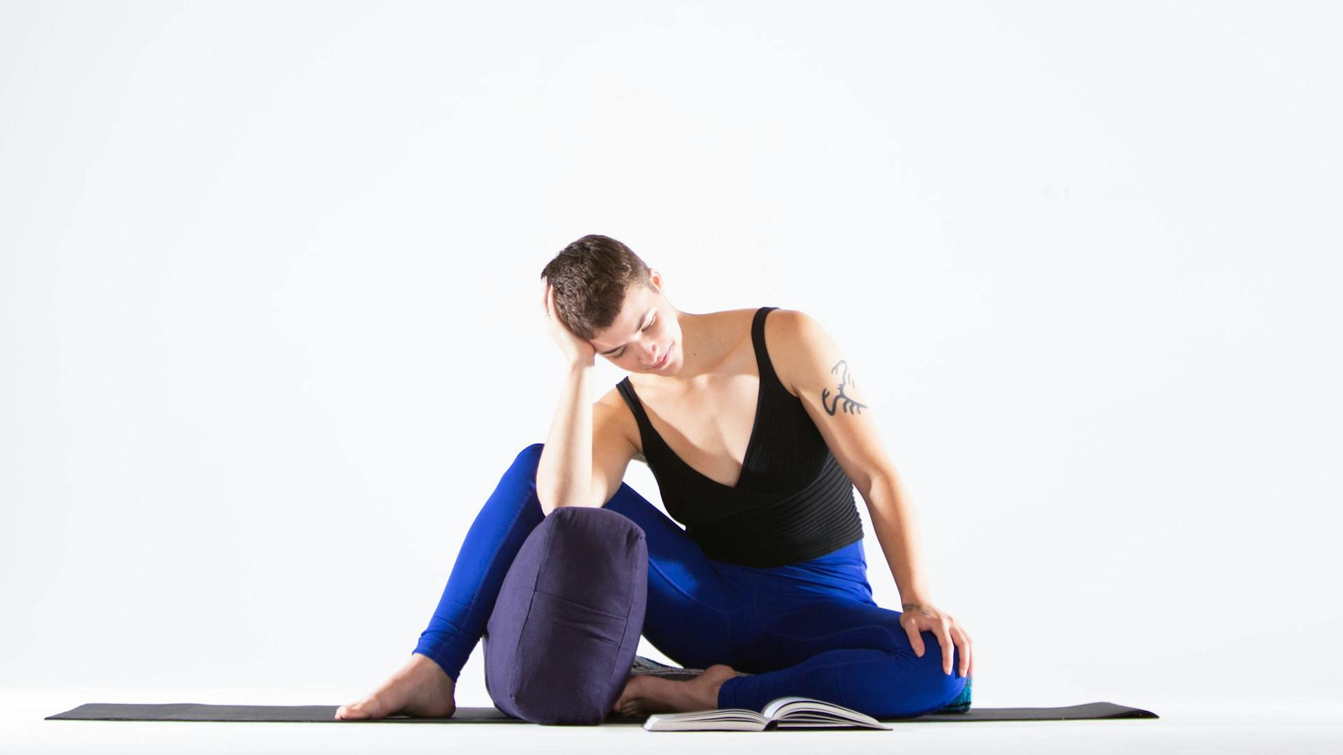 For this practice, you’ll need two blocks, one blanket, and two bolsters. (Though I’m usually a restorative minimalist, for the sequence below, I find that the extra bolster is the perfect podium for a book.) Throw another blanket over your mat for some extra padding if you’d like, and consider a book weight or book clip to help your pages stay open. And of course, grab a book—anything elevating!