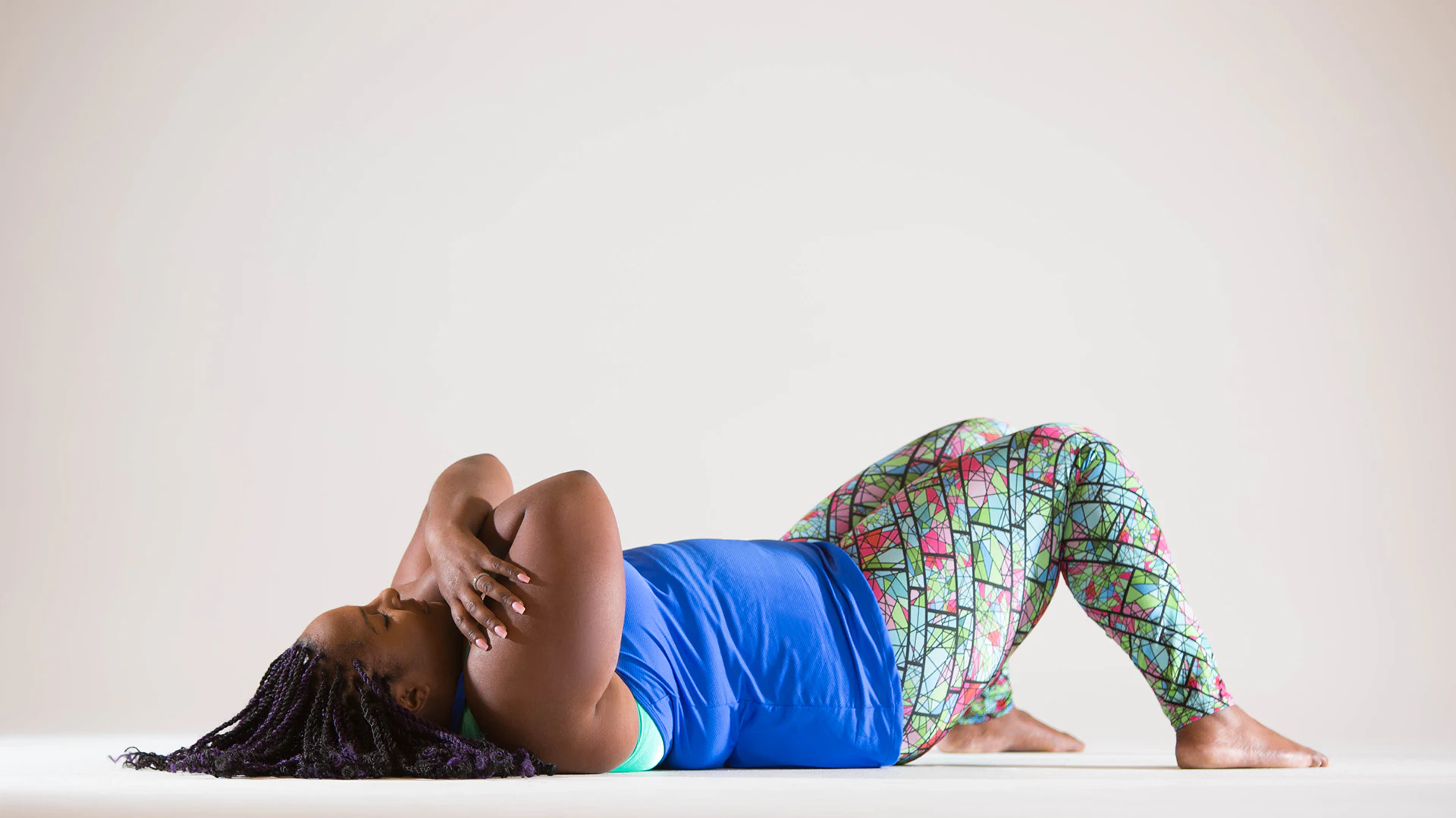 Begin in constructive rest pose: Lie on your back with your knees bent, feet wider than your hips, and toes pointed slightly inward to facilitate the inward rotation of your thighs. Let your knees rest against each other. Cross your arms over your chest, fingertips resting on your outer shoulders, and allow your elbows to drop down. With each exhalation, surrender a little more to the pull of gravity and the support of the ground. Stay for five to ten breaths. Then re-cross your arms with the opposite elbow on top, and repeat.