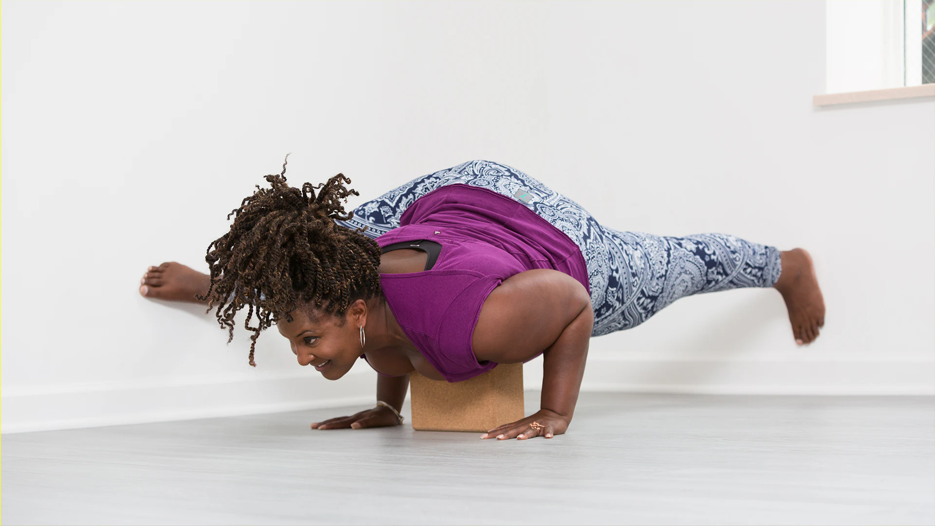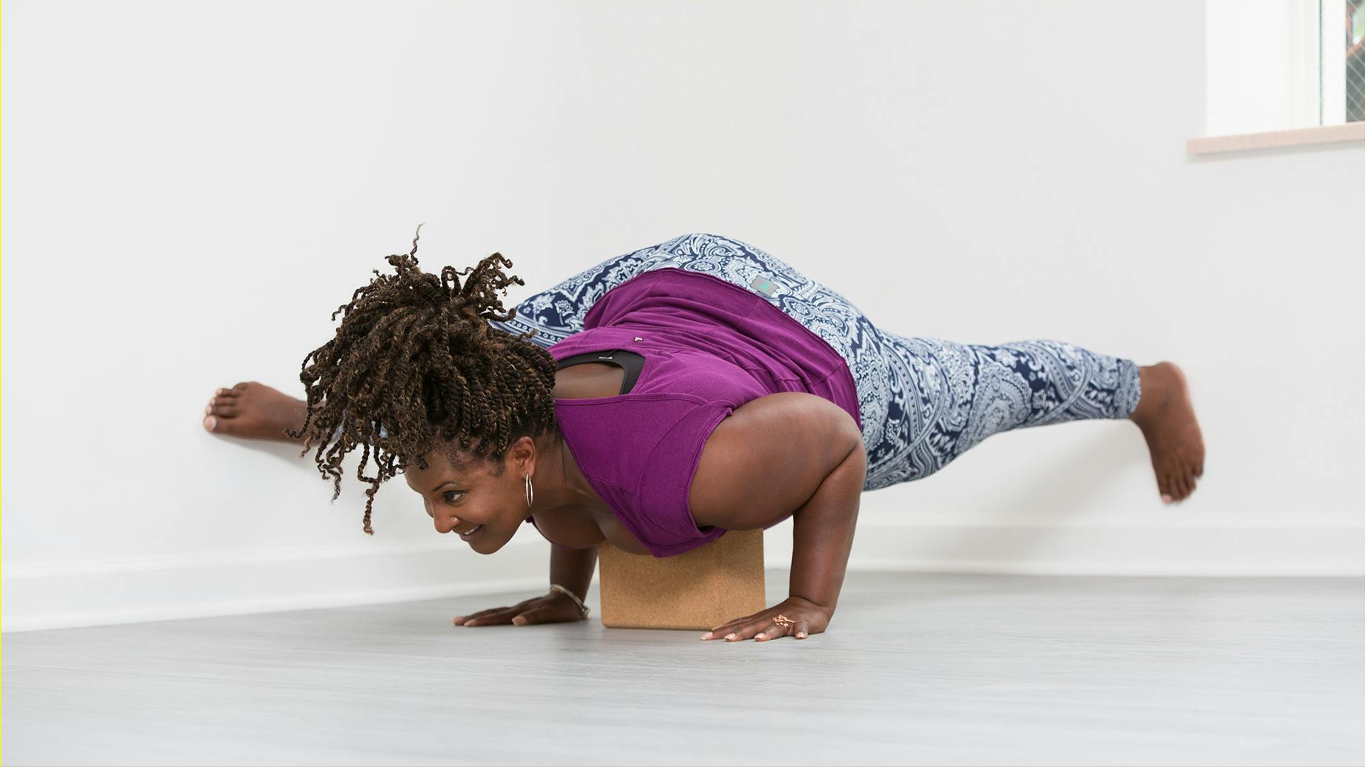 The arm balance eka pada koundinyasana II (sometimes referred to as “flying splits”) is a common offering in vinyasa classes, but it can also be inaccessible and frustrating for a lot of people. With the help of two walls, a room corner, and maybe a block, you may just find this high-flying hamstring stretch becomes a little more attainable and a lot more fun!