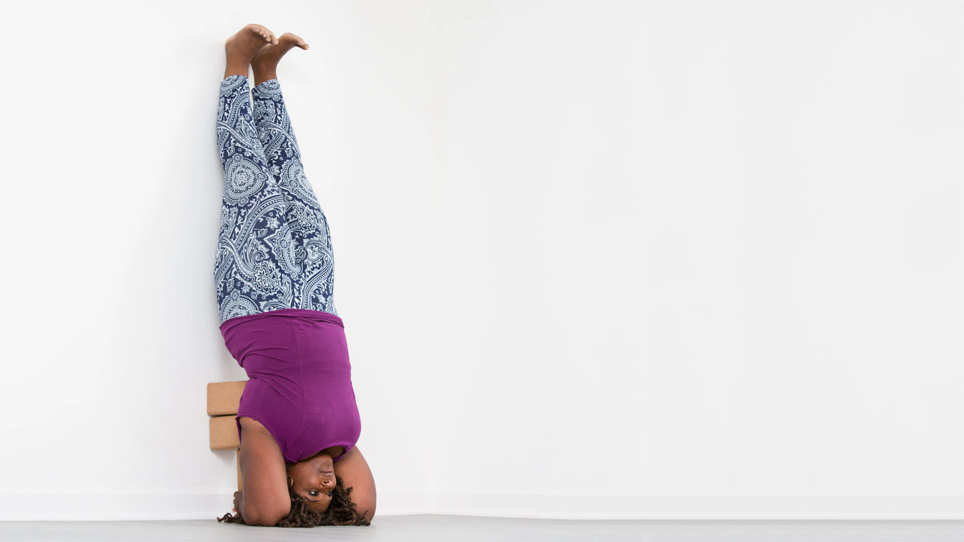 One of my favorite ways to teach people to go upside down involves the aid of three yoga blocks and a wall. It’s fun, supportive, and a lot less scary than attempting a headstand or headless headstand in the middle of the room. Practicing with the blocks allows you to remain supported and to gradually work toward moving your feet away from the wall.