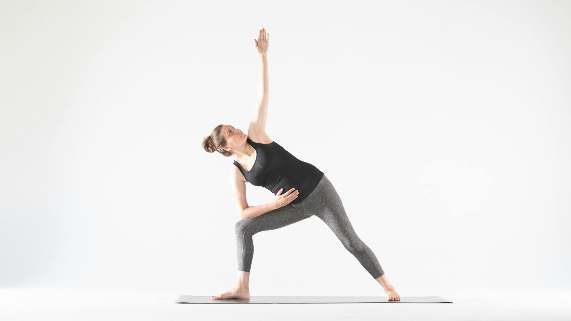 Come to the middle of your mat and face the long side. Step your feet wide apart and bring your hands to your hips. Turn your right leg out so that your toes point to the short edge of your mat and angle in slightly your back foot, leg, and hip. Bend your right knee until your thigh is level with the floor, aligning your knee over your ankle. Inhale your arms to shoulder-height into a T and then reach your right hand toward your front foot, tipping your pelvis sideways over your right thigh; bend your right elbow, resting your right forearm on your thigh, with palm facing up. Reach your left arm toward the ceiling. If your arms are long enough, you may be able to cup your belly with your bottom hand, connecting to your baby. Gaze straight ahead, or if it’s comfortable for your neck, look up toward your left hand.
