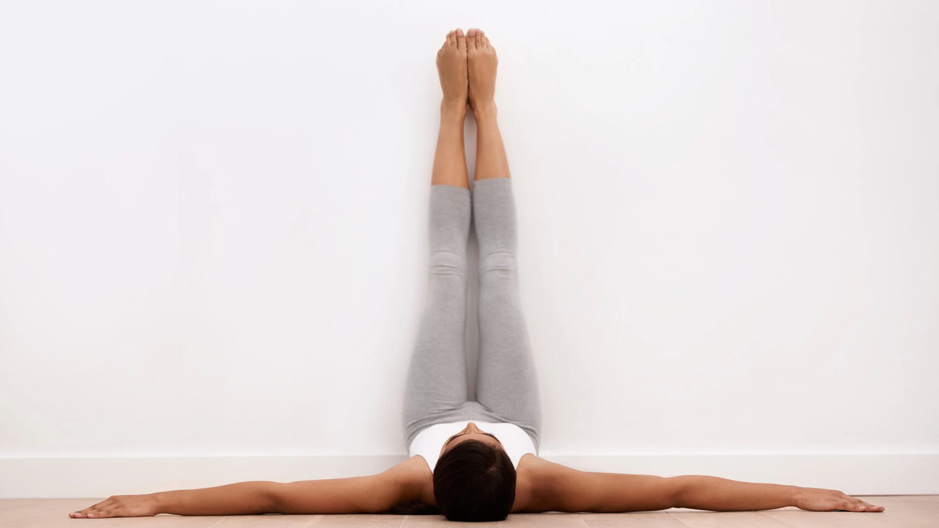 Lie comfortably on your back with the legs extended and the arms at your sides.