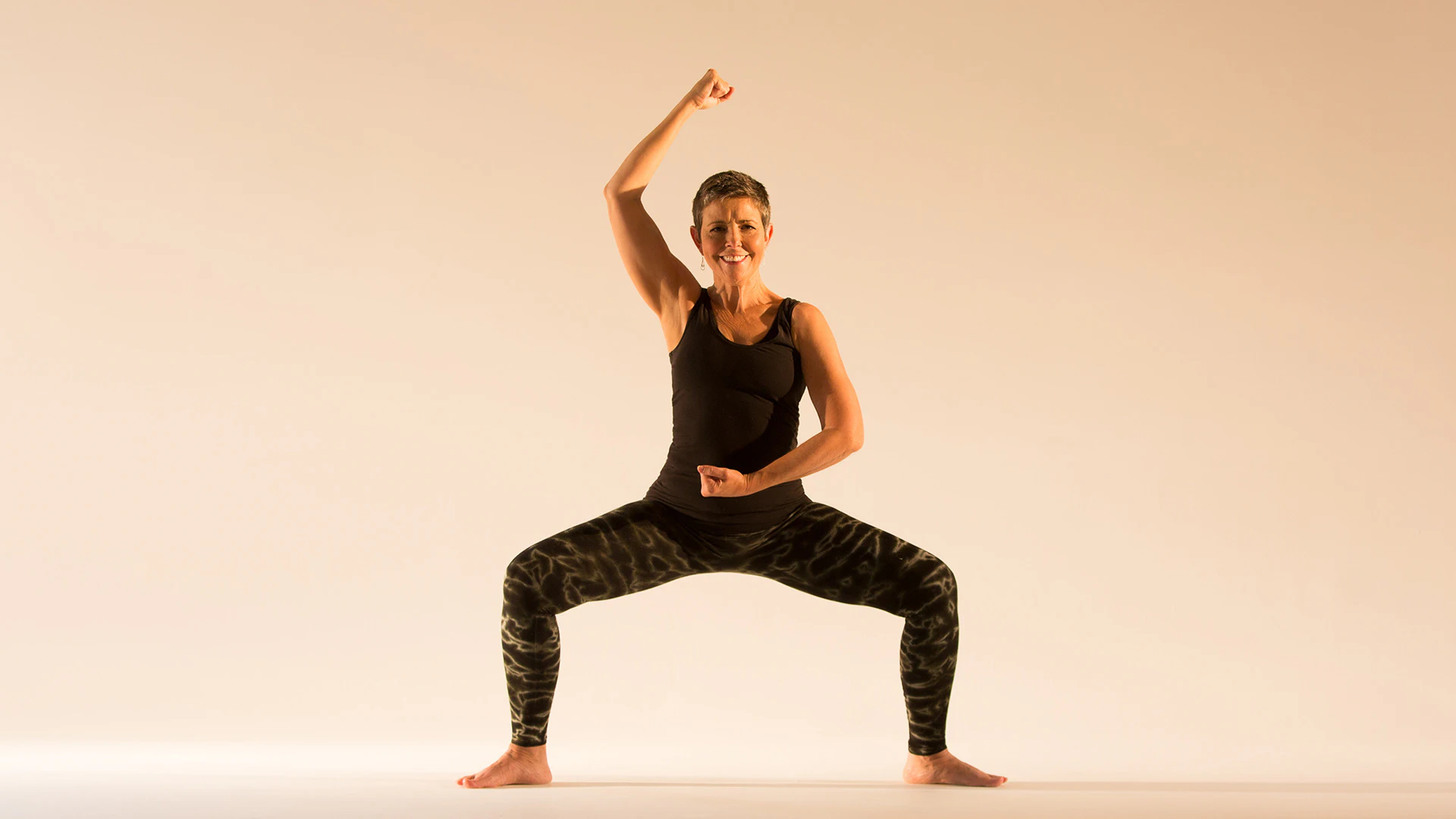 After your three breaths in warrior II, rotate your back foot out and your front foot in a little to come into goddess pose (a wide, high squat). Either make goalposts with your arms and twist from side to side (revolving at the waist while the pelvis stays stable), or, keeping your torso centered, make light fists with your hands and "lasso" your arms overhead (kind of like you're swimming the backstroke).