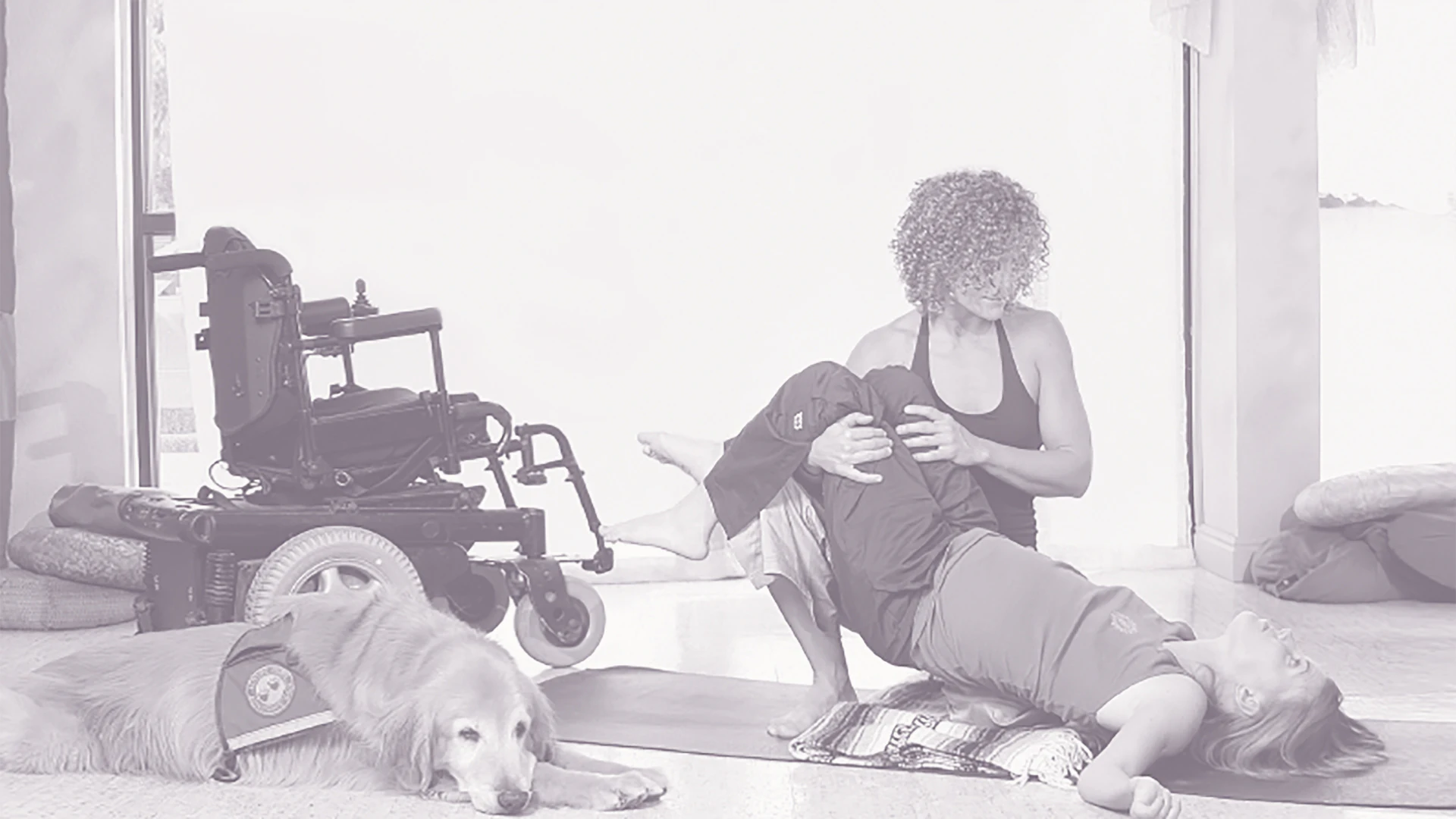 Crystal helps students like her sister and Hernandez out of their wheelchairs and onto the floor or a bed. Using blankets and other props, she stretches their arms, legs, and spines. “It’s not like Chanda is going to be doing wheel pose or bridge pose,” Crystal says. “But what she can do—and what makes a huge difference for her—is to live more outside of her wheelchair so she can experience gravity in a slightly different way.” When Chanda lies with a bolster supporting her spine, her shoulders sink toward the floor. The pose is an antidote to hours of sitting in a hunched position. “That’s Chanda’s backbend,” says Crystal, 31. “She gets the same intensity from that backbend that I would get from my fullest expression of wheel pose.”