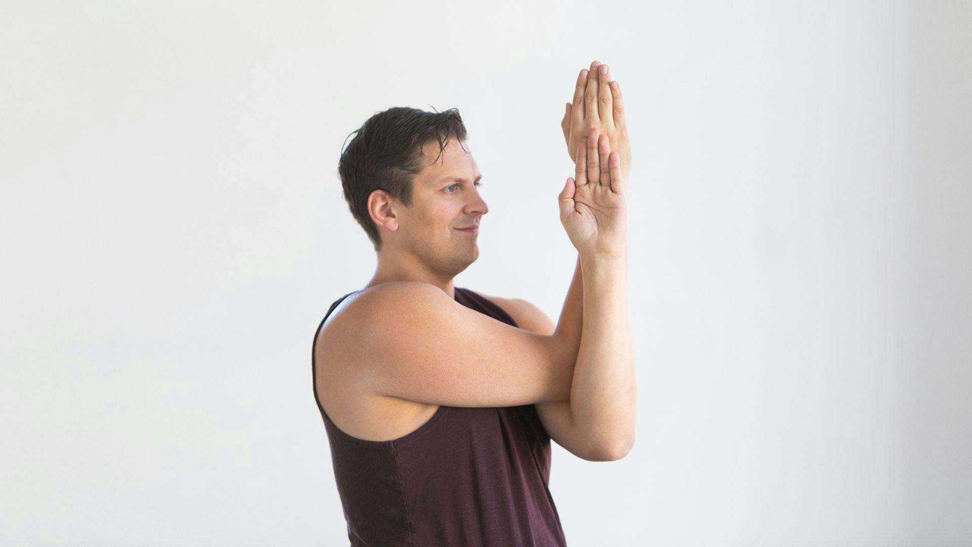 Option 1: Bring your palms together, but lift them to your forehead (as you would before a bow and “namaste”), working to create a continuous line between your forearms and the back of your hands.