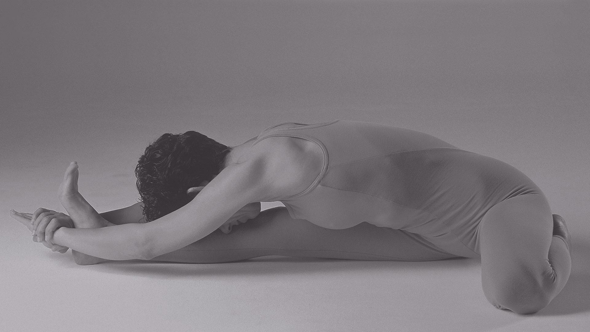 This position should not be mistaken for “hurdler’s stretch,” the all-too-common position of many runners, with the knee twisted to the side and the lower leg askew. The heel of the left foot should lie snug in against the left hip so that the leg is effectively in the hero’s pose (virasana) position. The weight should lie squarely on the base of the patella rather than listing to the inside of the knee. In this position the pelvis is remarkably free once again to revolve around the femur joints. Anchoring your weight over the left shin, allow the pelvis to float up and over the right leg. Once again clasp the wrists around the sole of the right foot and rest the forehead against the shin.