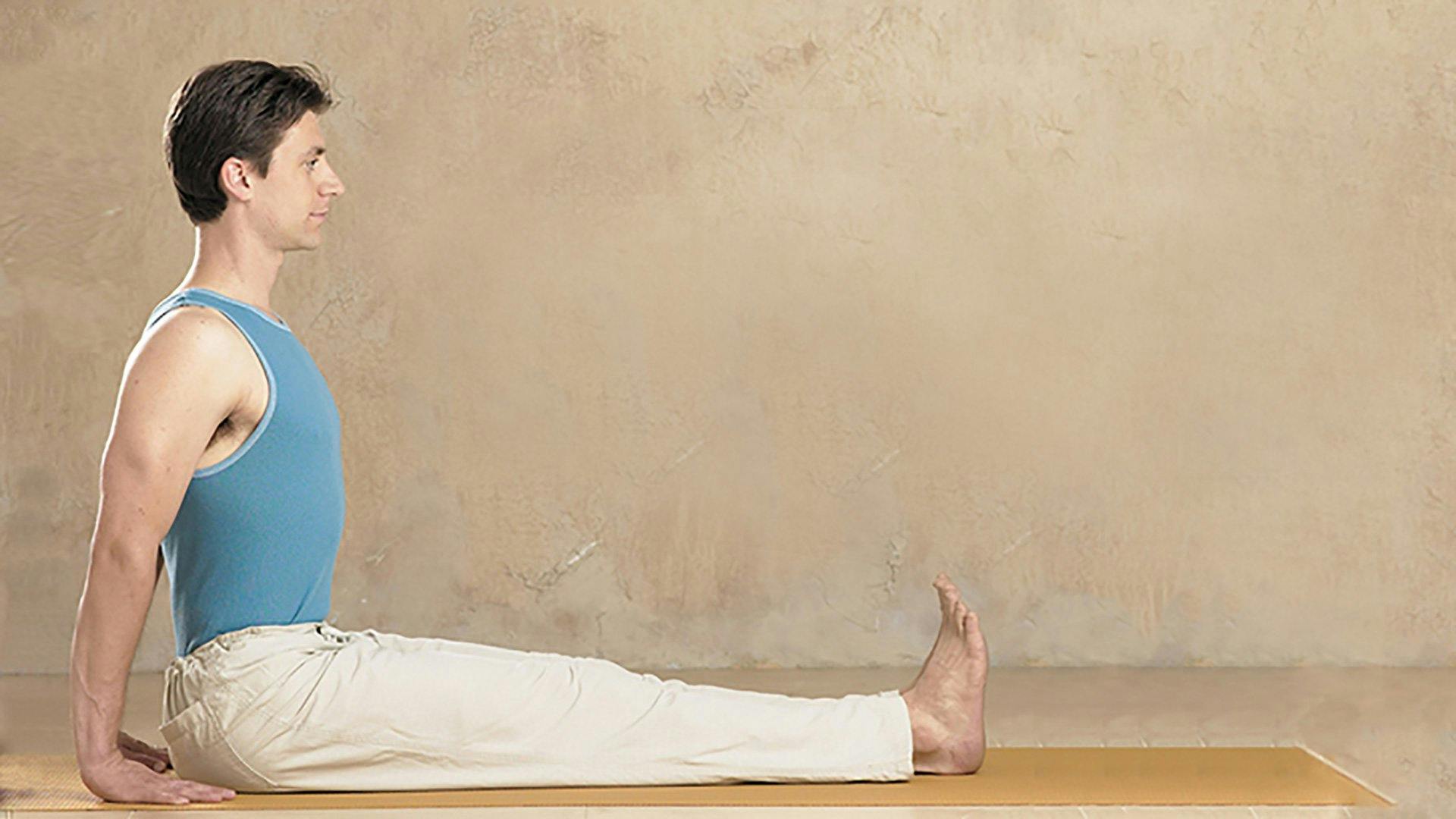 Dandasana is a simple seated pose that strengthens the deep muscles of the lower back, the abdomen, and the muscles deep in the pelvis. This improves overall posture and builds a solid foundation for the healthy alignment of the rest of the spine. Improved posture helps prevent the overworking or overstretching of any one muscle group and contributes to stability and comfort in all activities. On the other hand, a habit of poor posture can lead to serious back problems, including a greater chance of muscle strain and herniated discs. So a key element of the practice of dandasana is to cultivate awareness of the spine’s alignment from the tailbone all the way to the crown of the head and to use the strength developed by the practice to transform your habitual posture.