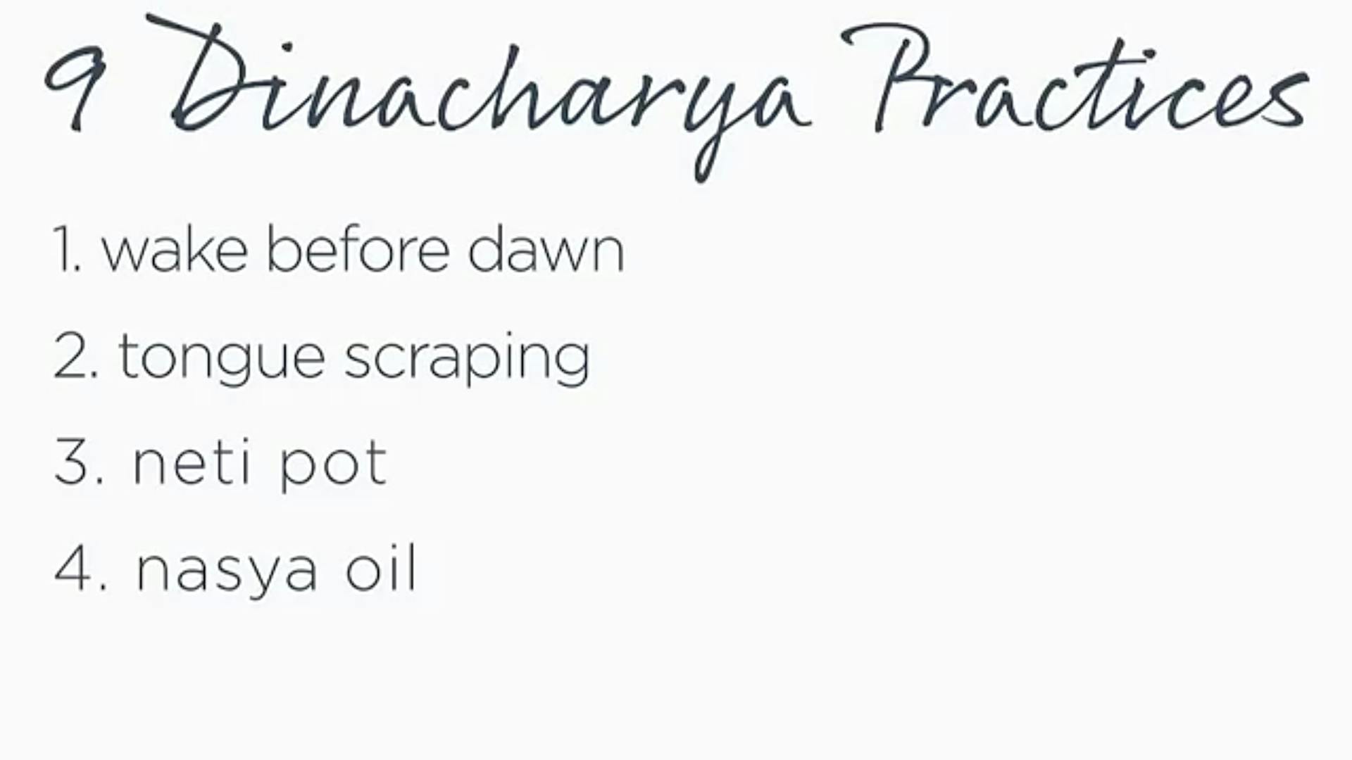 Dinacharya, or ayurvedic daily routine, has lots of benefits! Kathryn describes the top 9 practices in her morning routine—how they cleanse the body and prevent the buildup of toxins, help keep the senses and mind clear, and nourish the body. She also explains that repeating a routine every morning sets your day and gives you a feeling of stability and steadiness, and she offers advice on how to gradually ease your way into the routine, rather than beginning with all 9 practices.