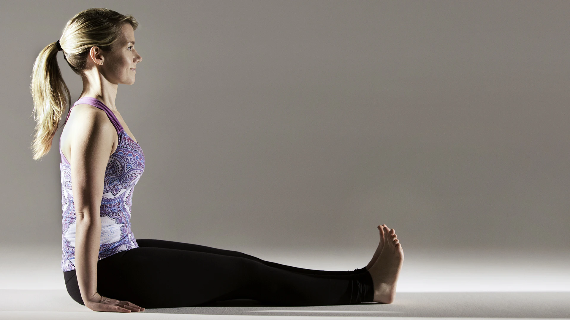 You may discover that tight hamstrings drag your sit bones toward your knees, making it difficult to sit upright. Try this: Keeping your feet flexed and your legs active, use your hands to roll your inner thighs down toward the floor and your outer thighs up toward the ceiling. Then, rolling to one side, reach underneath and move your buttock flesh back on the side that's lifted (not out to the side like you just did with your thighs, but back toward the wall behind you). As you sit back down, notice the difference in your two sides. Now do the same thing on the other side. Moving the flesh back can help you balance your weight more evenly between both sit bones, and it shifts you more forward onto your sit bones, which may help prevent rounding in the lower back. It can also help to set the thighbones deeper into your hip sockets, making you feel very stable and grounded. Those with injured or hyperflexible hamstrings should proceed with caution. If this action creates pain, it is not for you right now.