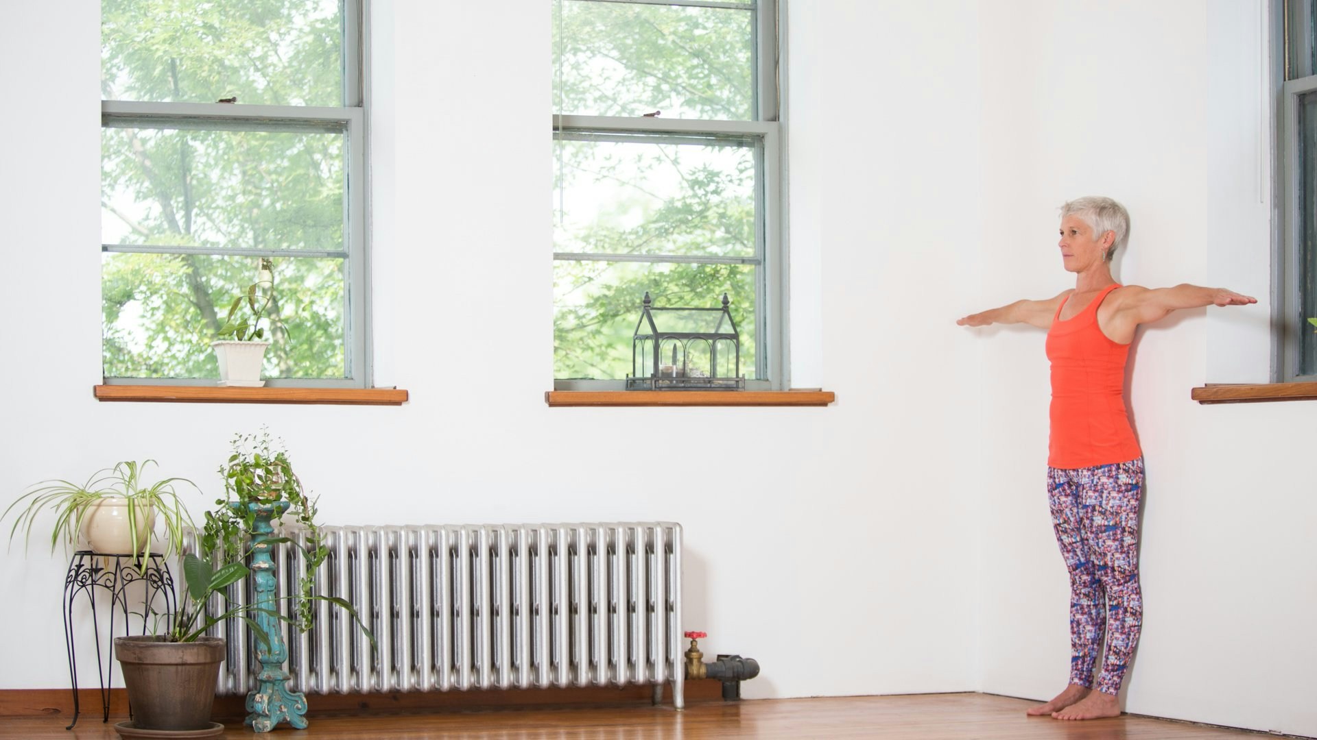 2. Quarter Sun Salutations at Wall Stand in mountain pose with your back against the wall. Start with your arms at your sides, palms against your thighs.