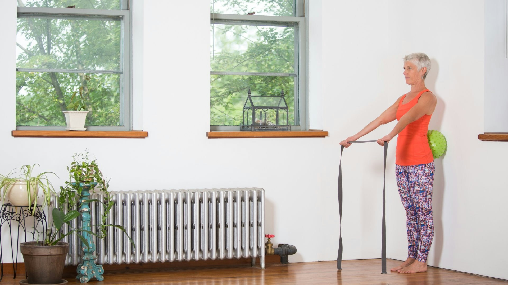 Hold a yoga strap or belt at waist height in front of you, with your palms facing up and your wrists smooth, hands about three feet apart, and the eyes of your elbows facing up. Pull on the belt until it’s taut, pinch your shoulder blades together, and press your lowest back ribs into the ball.
