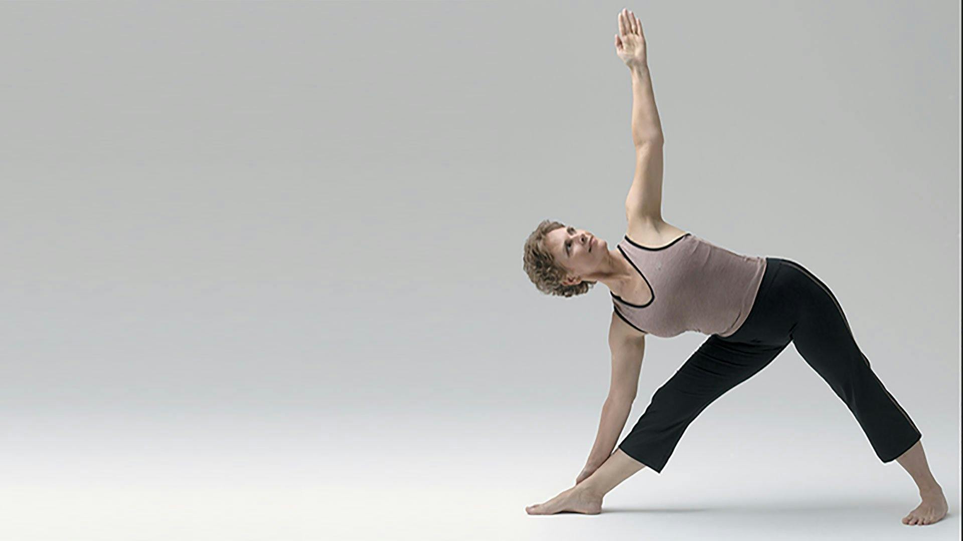 Rather than pulling your pelvis backward, make sure that your sacrum moves into your body, toward your abdomen. Keeping the back leg straight and grounded, lengthen from the tailbone to the crown of the head while reaching the arms wide and turning your navel gently toward your top hand.
