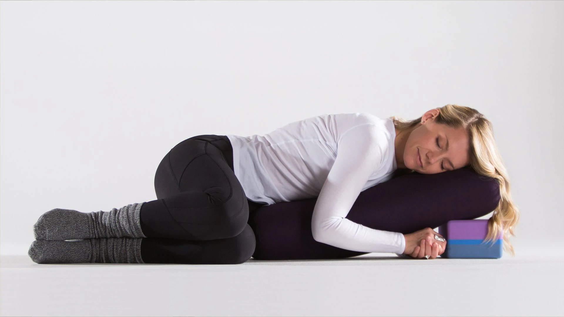 Note: To keep your legs on the bolster effortlessly, feel free to swaddle your legs in a blanket, or loop a yoga strap around your calves or ankles.