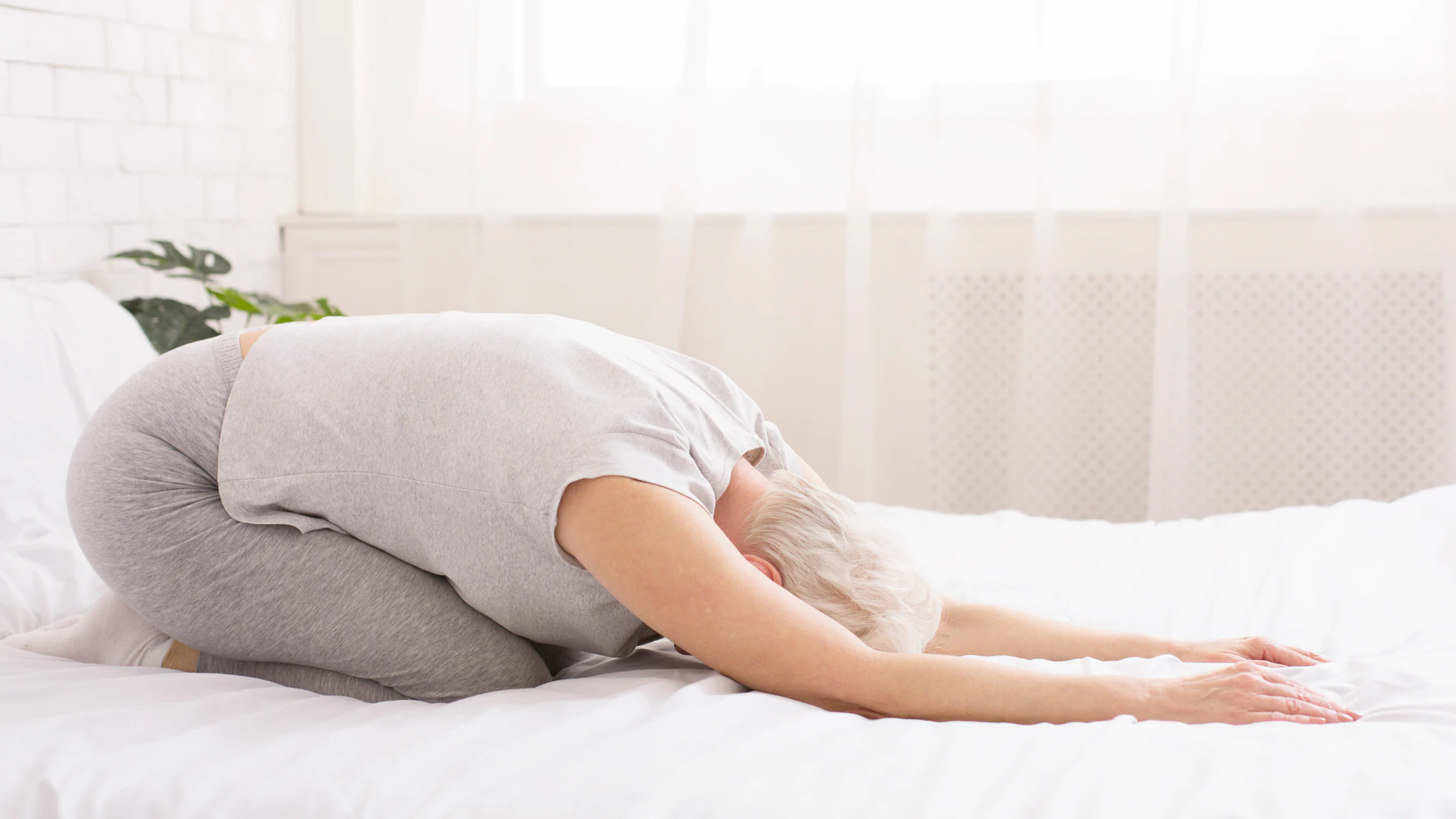 Lying on your back, bend your knees and set your feet wide apart on your bed. Slowly windshield-wiper your knees side to side three or four times, mobilizing your hips and low back as you deepen your breath.