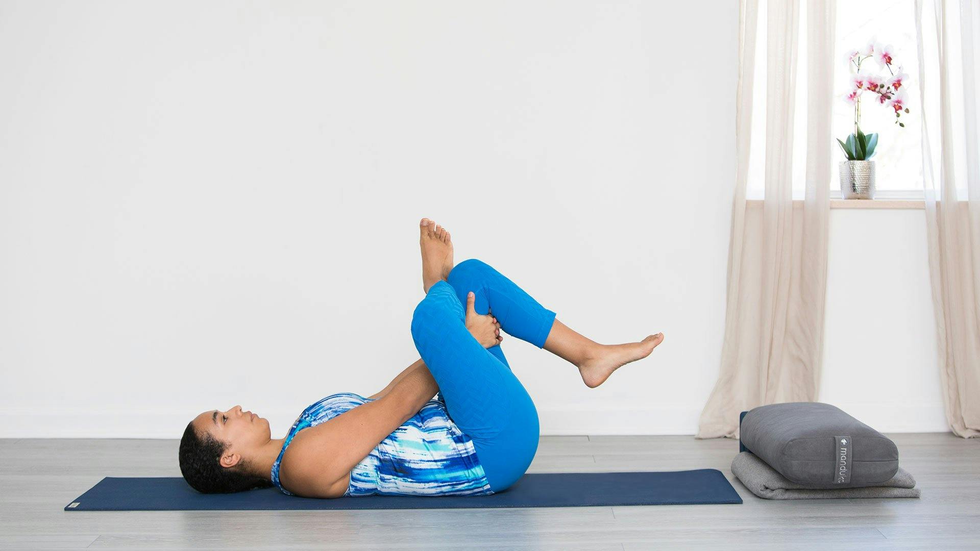 Sit higher in poses such as bound angle and (head-to-knee pose). Sit up on props, such as a folded blanket or low bolster, to angle the pelvis forward in seated postures, allowing the knees to drop below the pelvic rim. If the knees remain above the pelvic rim, one can support the thighs by placing blocks or folded blankets underneath them, putting less stress on the medial meniscus.