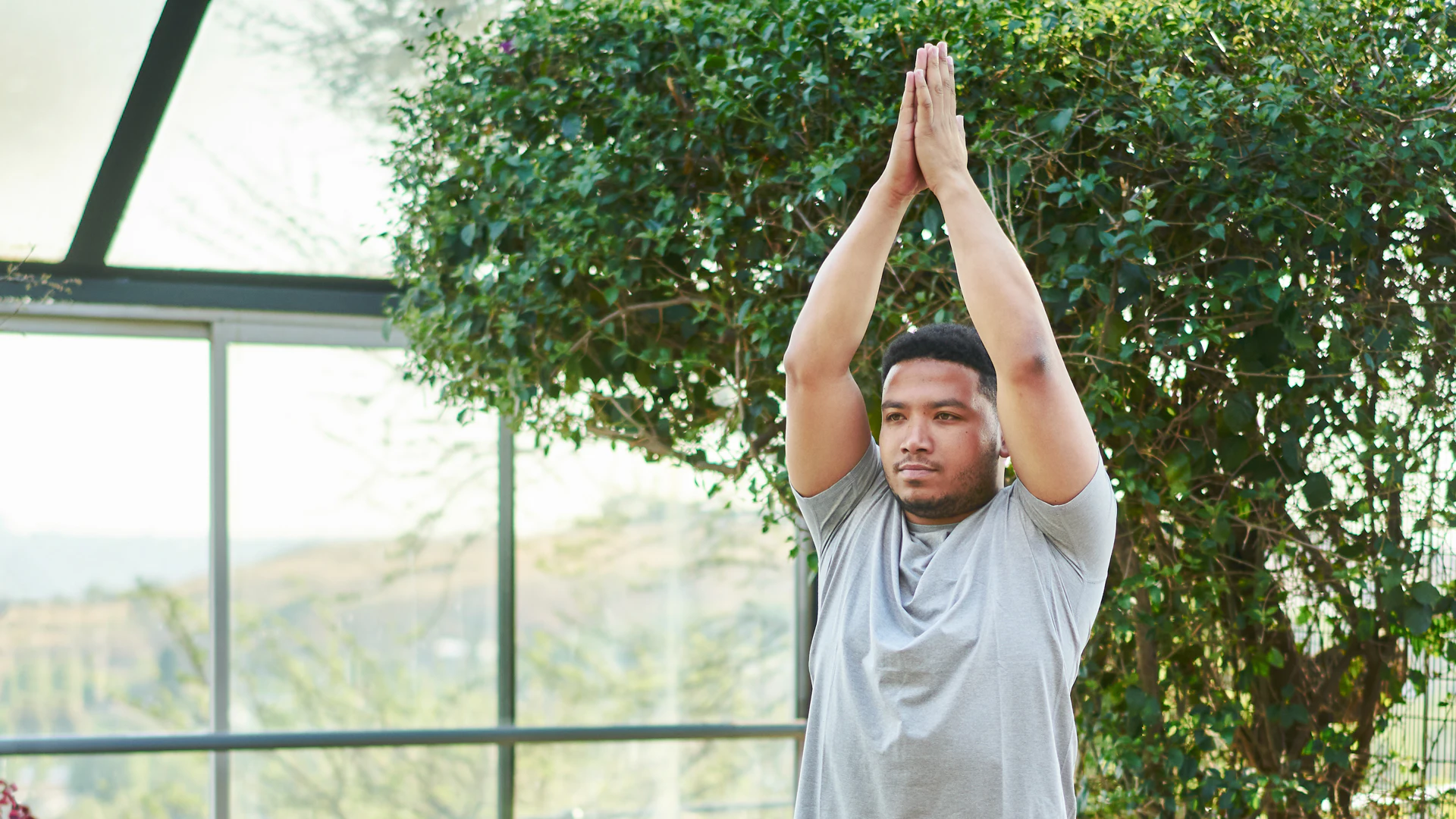 Stand in tadasana (mountain pose) with your feet together or hip width apart if that feels more stable. Lift your arms overhead and separate them as wide as your shoulders.