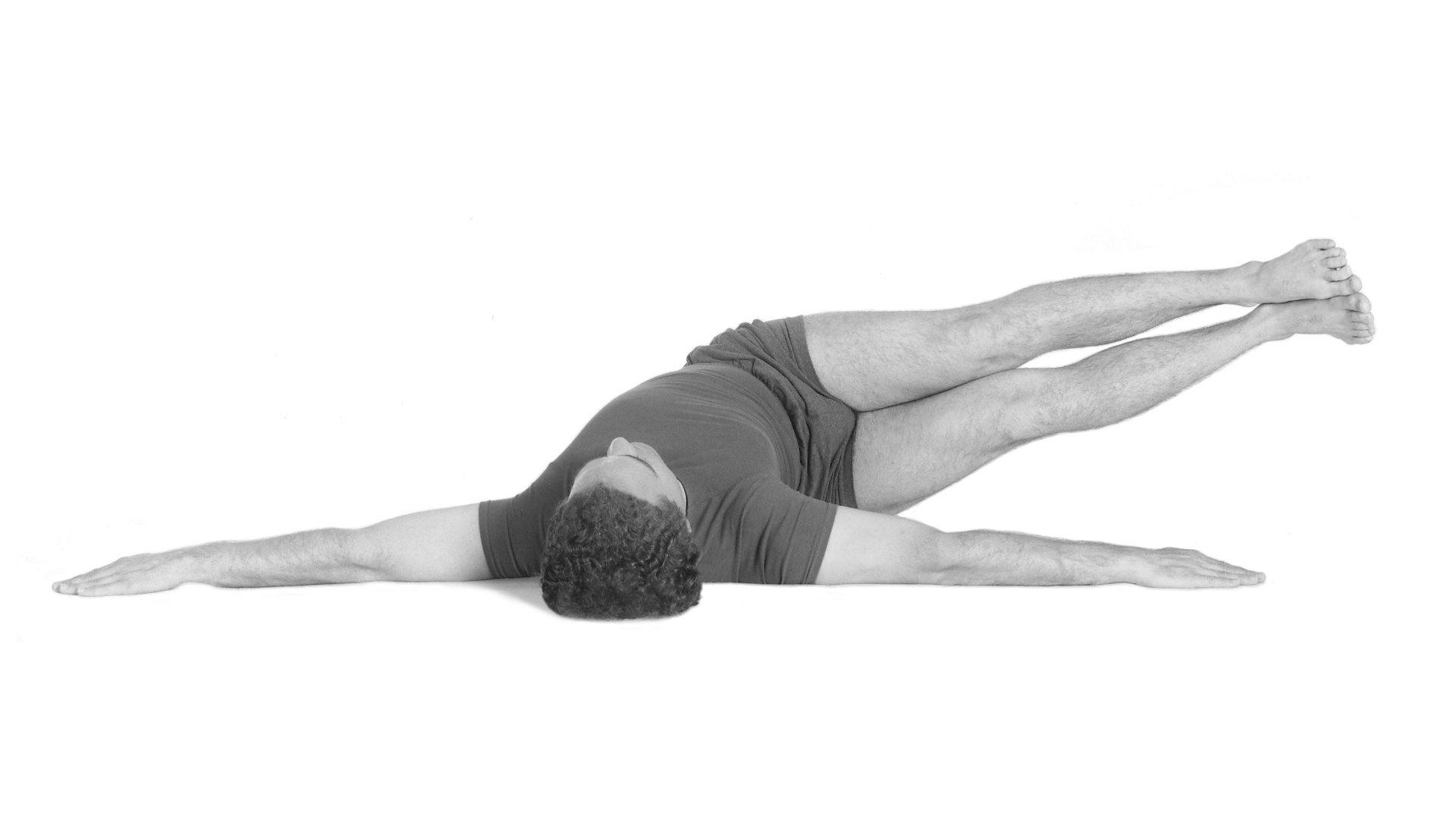 Squeeze the legs together and contract the pelvic floor, press the left shoulder into the floor, and gently turn the abdomen to the left as you lower the legs to the right. Reach the feet toward the right hand.