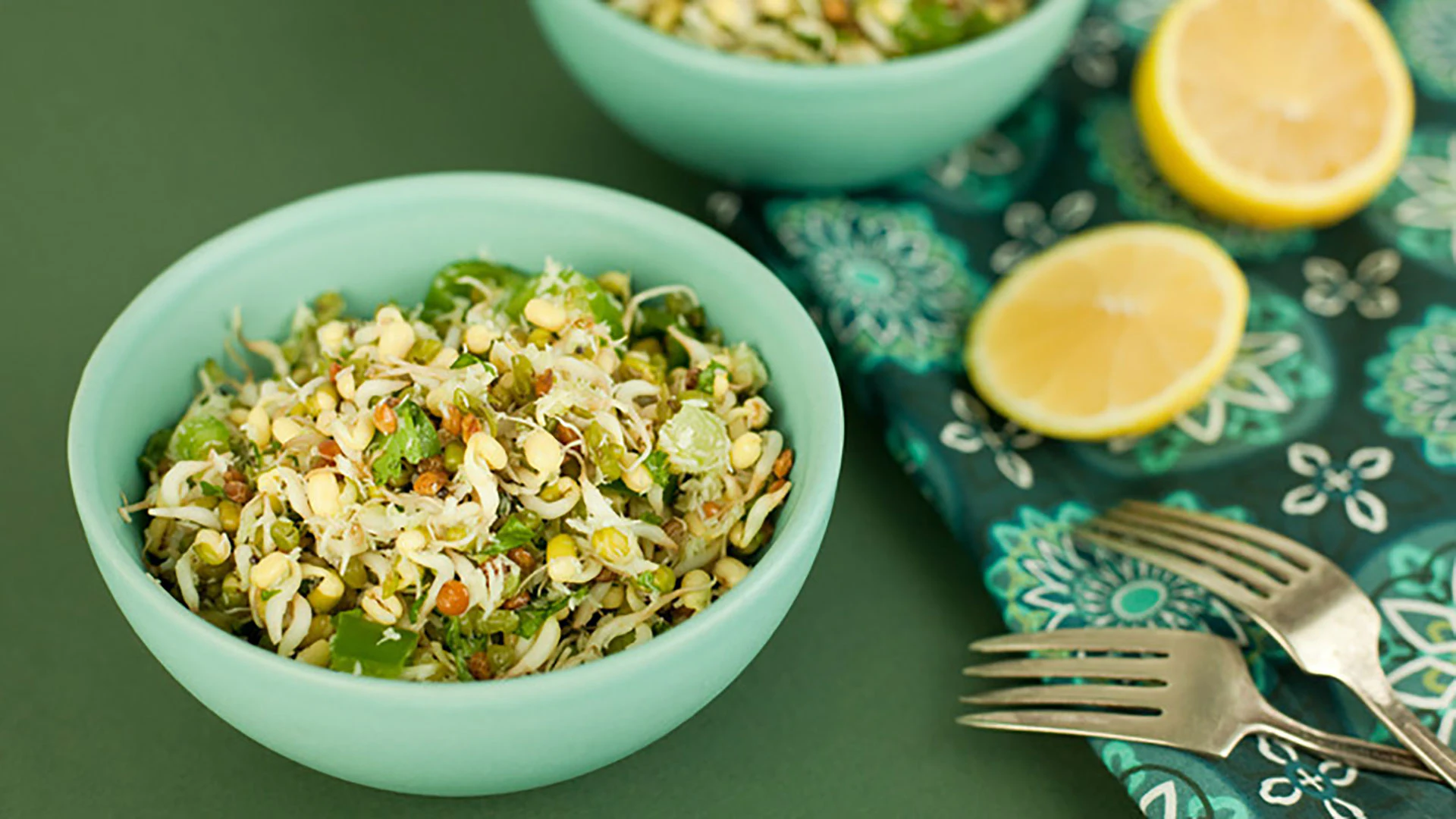 The most famous South Indian salad is kosumbri, which is said to be the favorite food of Lord Krishna. It can be made with various ingredients but usually contains sprouts. In this version two kinds of lentils (channa dal and urad dal) and mustard seed are lightly fried and added to give an unusual crispy texture.