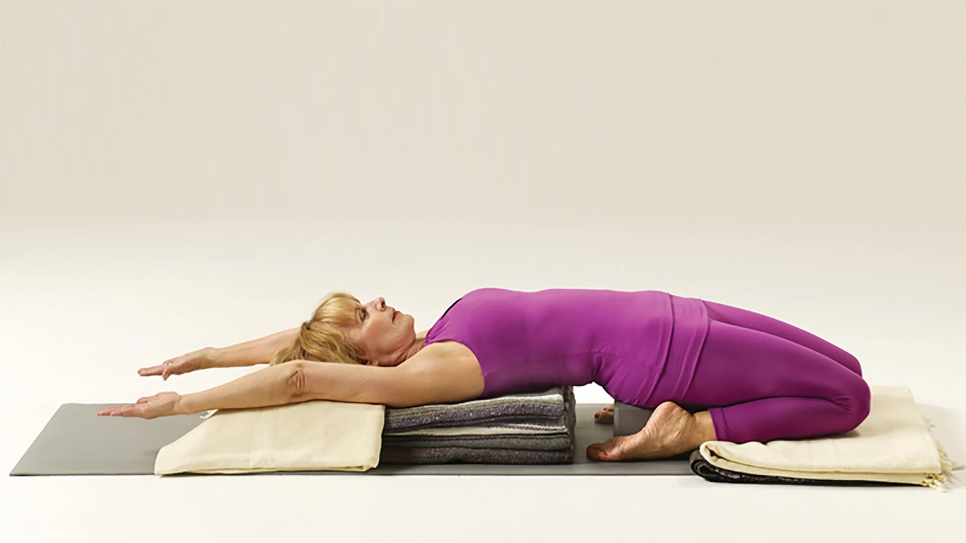 Keeping the thighs parallel, press the tops of your shins toward the floor, tilt the top of your pelvis back, and lie down on the props. Lengthen your lower back by setting the back of your lower rib cage on the props as far away from the knees as you can. Adjust your head support so your forehead is slightly higher than your chin. Reach your arms overhead, in line with your body, and stretch them as far away from your knees as you can, feeling your belly elongate and the sides of your waist lengthen. Breathe easily and rest comfortably until it is time to return to action.