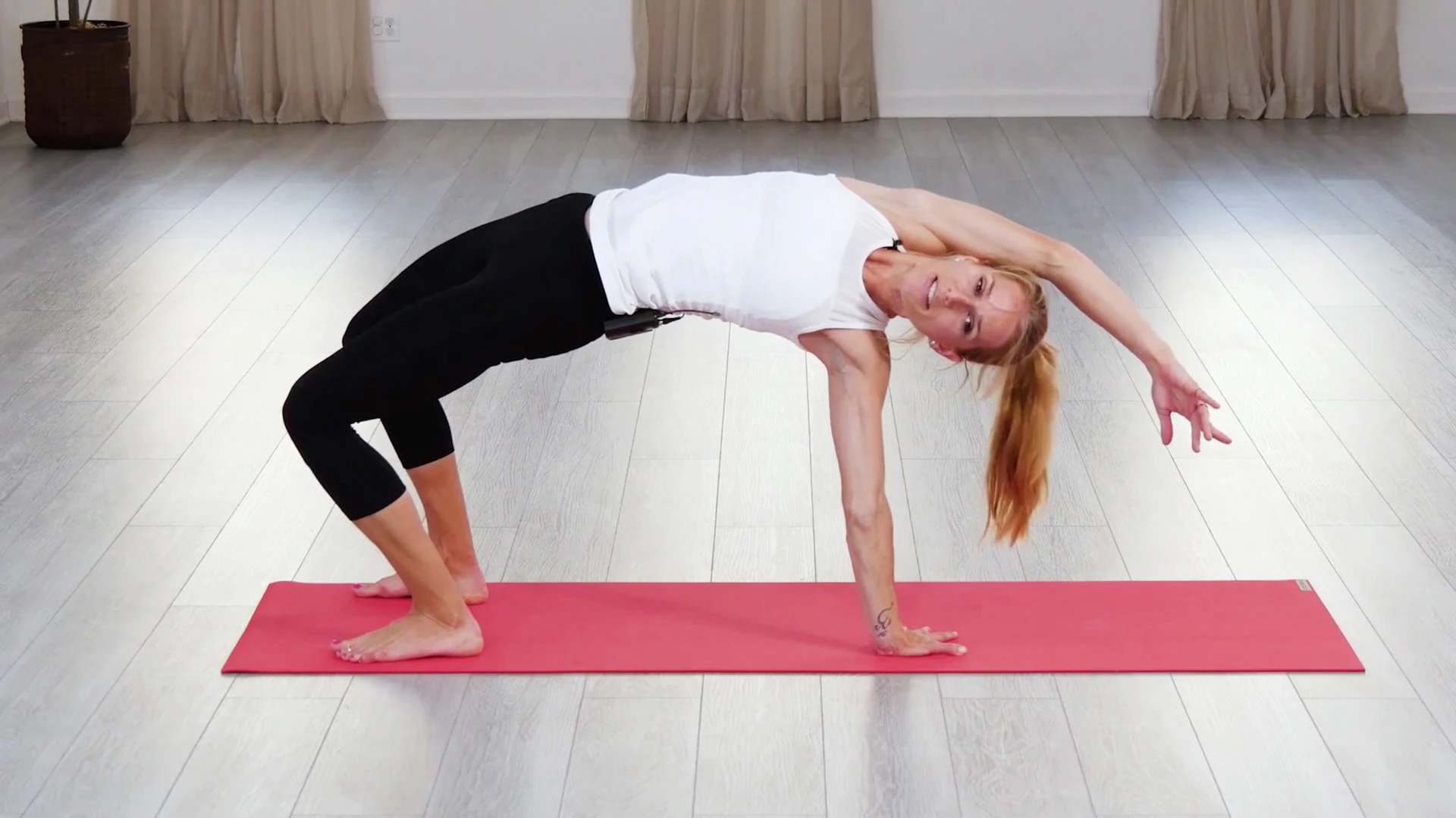 Explore flipping from downward facing dog into wheel pose, and then from wheel pose back into downward facing dog (again and again)! This "outside of the box" practice will take you beyond the borders of your mat.