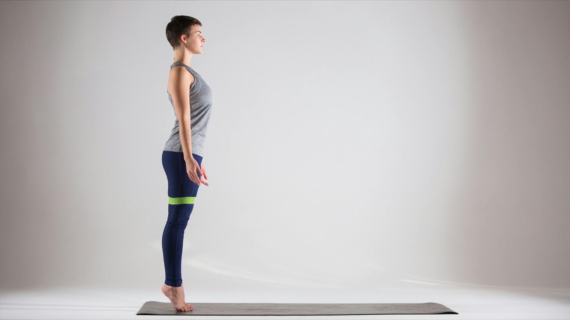 For this pose and many that follow, you’ll be placing your resistance band or your looped yoga strap just above your knees as you stand in mountain pose. If you are using a resistance band, stand with your feet far enough apart that the band is taut. If you’re using a yoga strap, stand with your feet hip distance apart and make sure your loop is taut but not so tight that it pulls your knees inward. (Your knees should track toward your middle toes.)