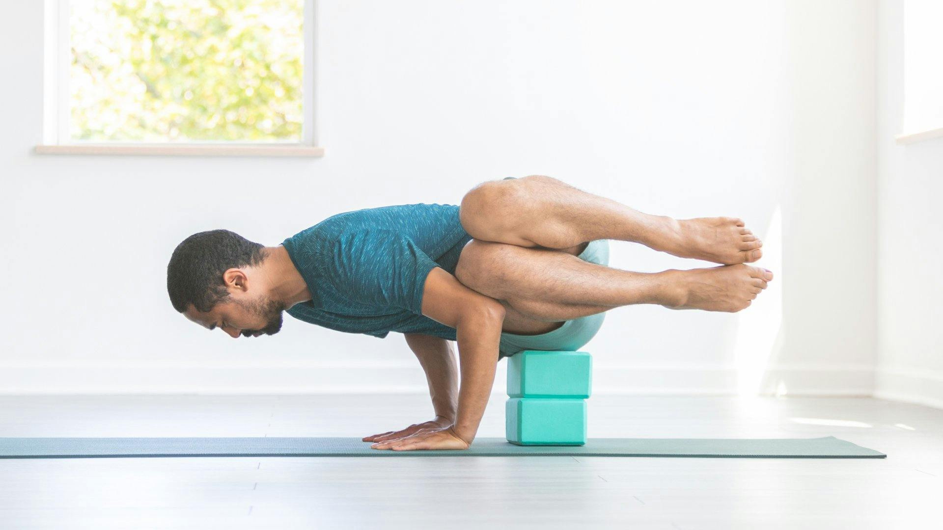 Side crow and eka pada koundinyasana I involve deep twists and require balancing the weight of the body solely on one arm while maintaining a strong connection between the lower and upper body, which is essential for success. The following setup makes the arm-leg connection more attainable by supporting the weight of the hips. To get started: Start with two blocks stacked on top of each other on their lowest setting.