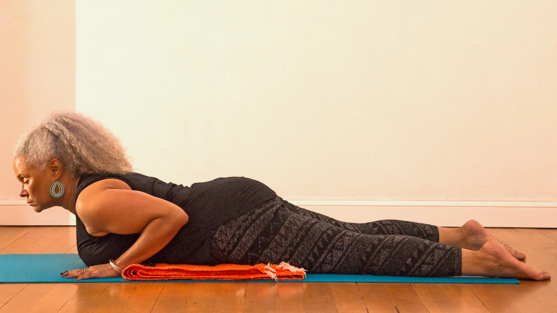 To avoid pressure or pinching in the low back, it can be helpful for students to place a folded blanket underneath the abdomen when practicing cobra. The blanket raises the top of the pelvis and lengthens the lower back by reducing the lumbar lordosis (the curve of the lower back).