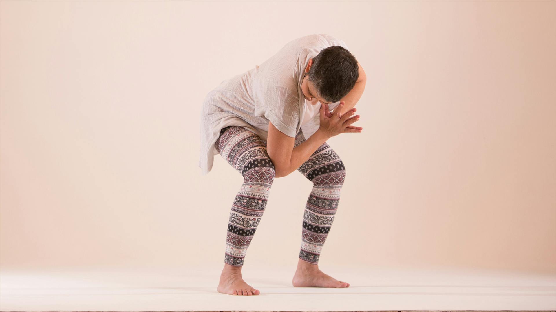 Stand with your feet a bit more than hip width apart and bring your hands into (prayer position) with your elbows wide. Bend your knees until, when you twist, you can take your right elbow to the inside of your right knee without rounding your back. Gaze down toward the floor. Inhale here, then on an exhale, contract your pelvic floor and lower abdomen as you rotate your face upward and roll your left shoulder back. Inhale as you look down again, untwisting slightly.
