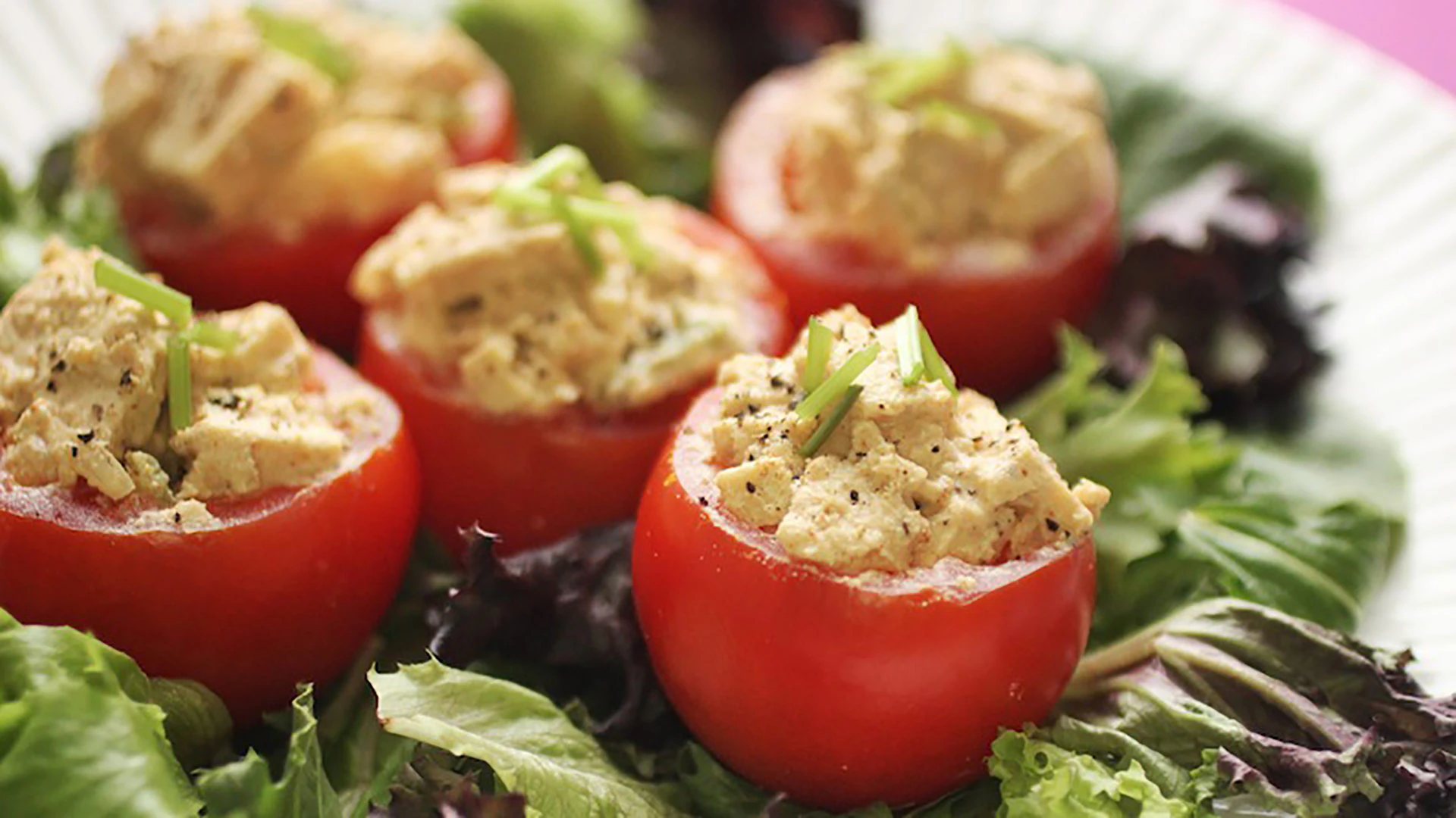Tofu is perishable and difficult to keep on hand. My solution is to buy two pounds at a time—one for immediate use and one to be tucked away in the freezer. Wrap the tofu destined for the freezer in a towel for 15 minutes to drain the excess water. Then put it in a plastic container with a tight-fitting lid and freeze. Thawed tofu resembles a sponge and is much chewier than the fresh variety. It lends itself to dishes that need a meatier, chewier protein—such as chili and this “chickenless” salad. Use this salad as a sandwich filling, as a dip for fresh vegetables, or as a stuffing for tomatoes.