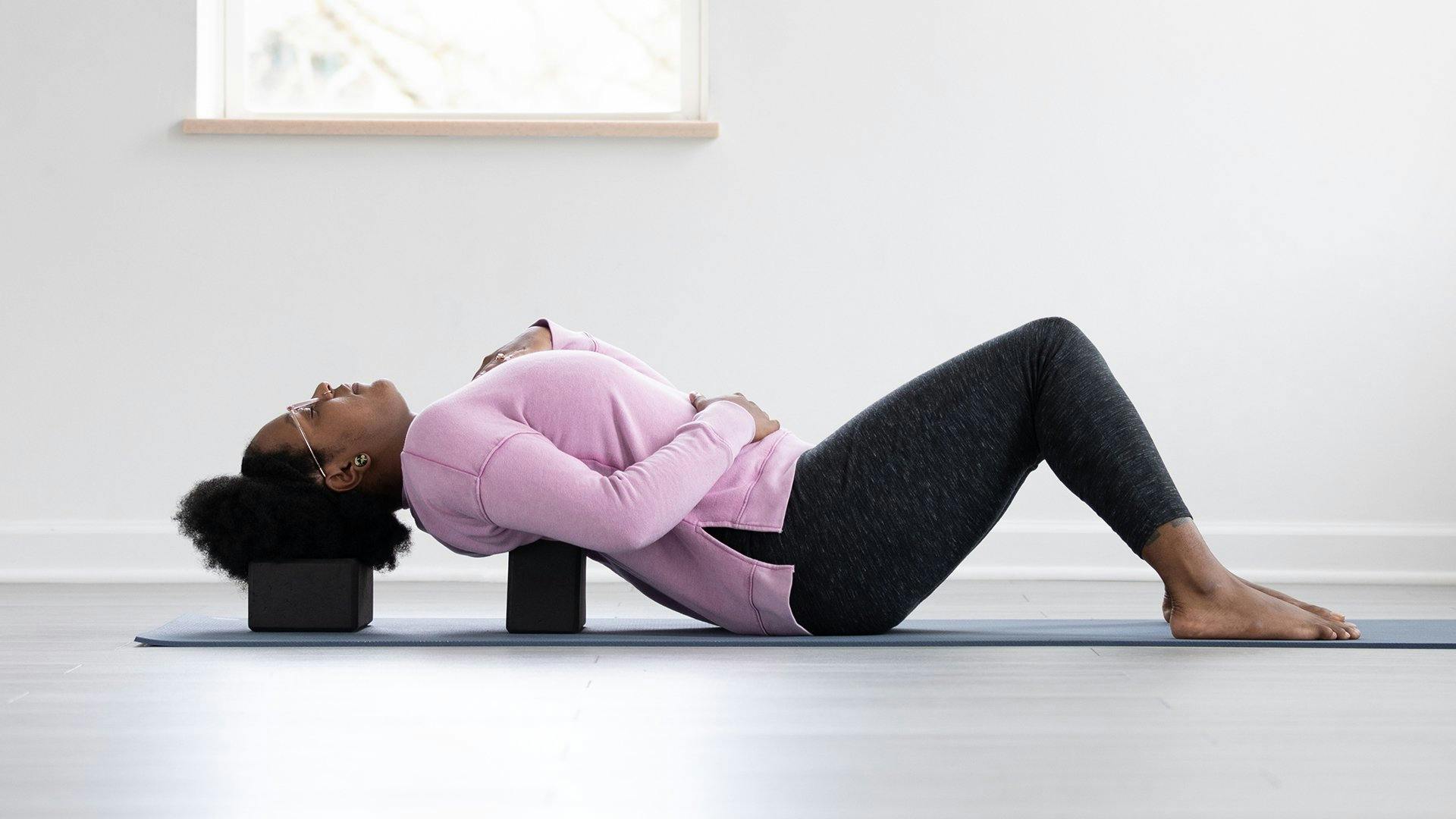 Place two blocks horizontally on the back third of your mat: one on its medium or high height (which will be behind your shoulder blades) and another on its medium or low height (which will go under your head). Note: Depending on the size of the blocks and the length of your torso, you may need to experiment with finding a comfortable position for the blocks.