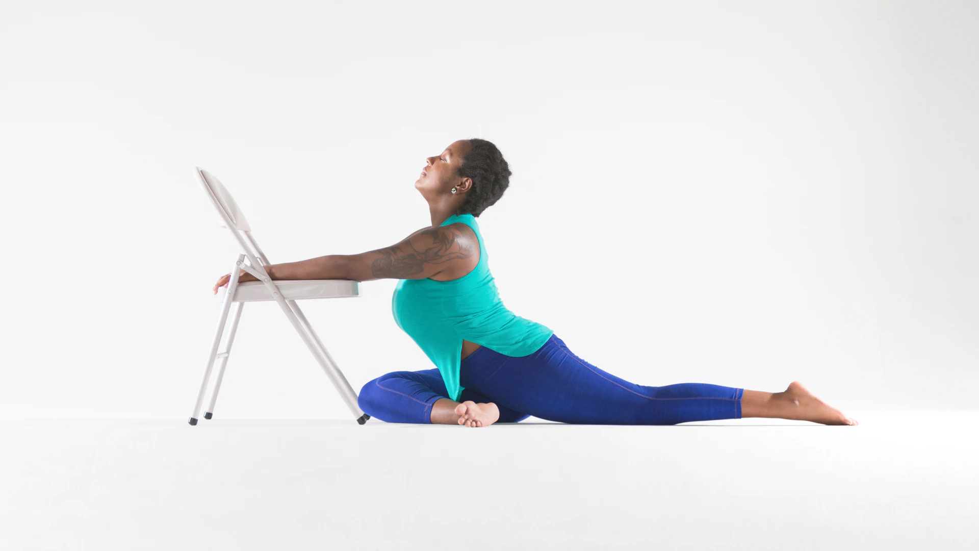 The chair makes pigeon pose versatile, allowing you to make it accessible, supportive, or more comfortable than your unpropped pigeon.