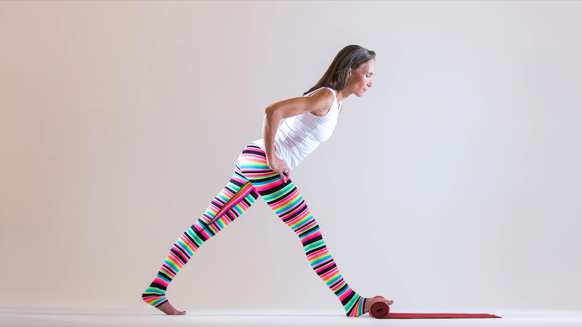 Keeping the ball of the right foot on the rolled-up mat, step the left foot back into a short lunge, feet about hip-width apart. Maintain a slight anterior (forward) pelvic tilt so that your lower back gently curves in. Stay for three breaths so your hamstrings have a chance to relax.