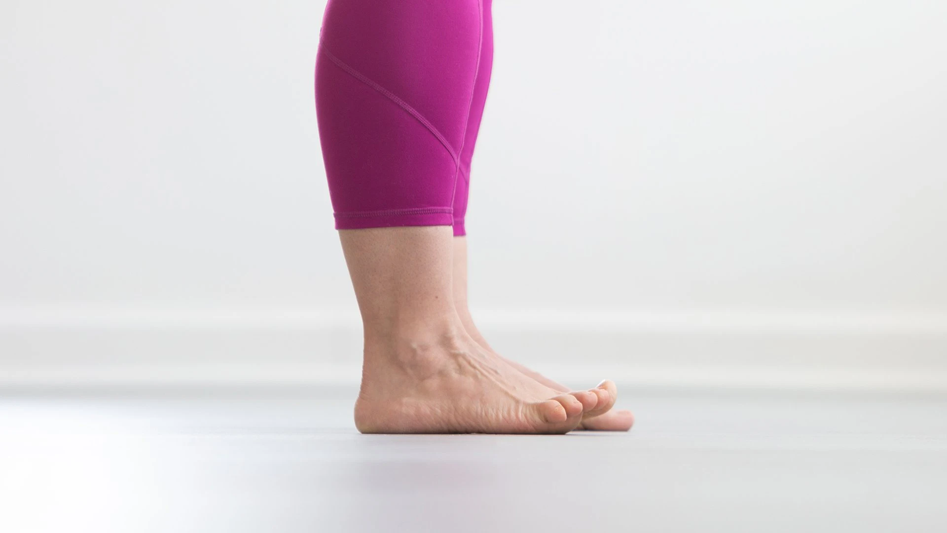 Now, make sure that your shins are parallel to each other as you press down firmly through the outer edges of both feet and big toe mounds, and see if you can focus on maintaining even weight distribution between these two areas. You should feel a slight lift in your arches. As you find yourself standing throughout the day, try to bring this level of awareness and engagement to your feet, especially if you tend to pronate or supinate.