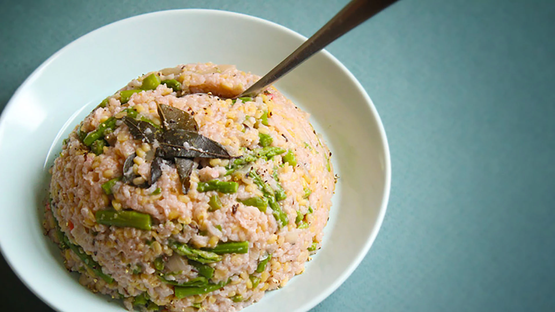 6. Fifteen minutes before serving, steam the asparagus and stir it into the kichadi, with: