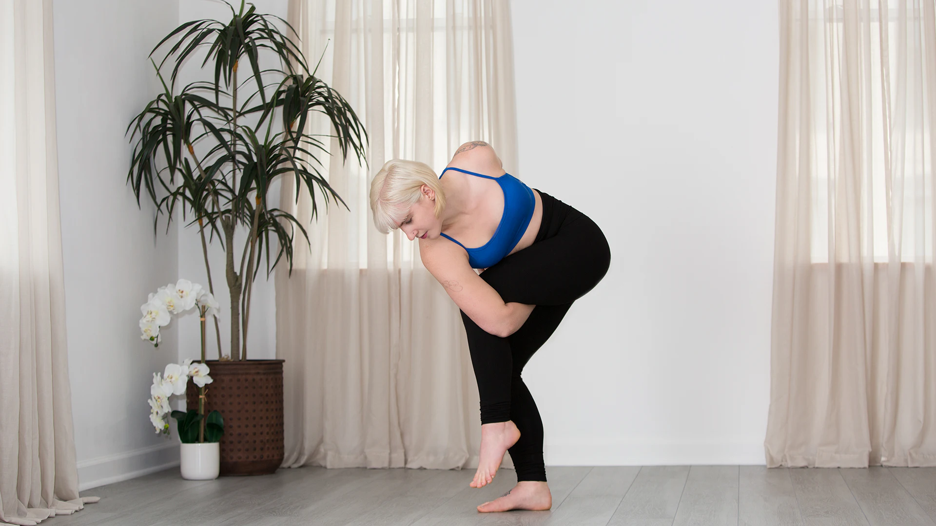 When you’re ready to come out of the pose, you can simply release your bind and lower your left foot to meet your right foot in tadasana (mountain pose). Or for an added challenge, come out of the pose the way you came into it, but in reverse. Rebend your left knee and hinge forward, lowering your left foot to the floor with control. Then step your right foot back into a lunge, release the bind, and transition to the second side.