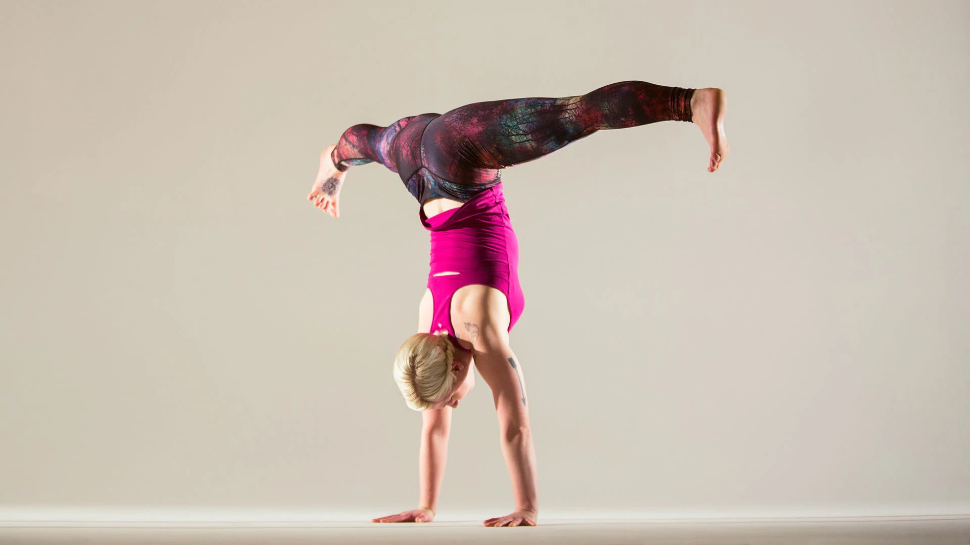• As your bottom foot floats up, extend that leg out to the side, and then straighten your other leg, extending it out to the side as well, to come into a handstand with both legs out wide, as in . Then draw the legs in toward center from there. (It’s also fine to just stick with a wide-legged handstand for now!)
