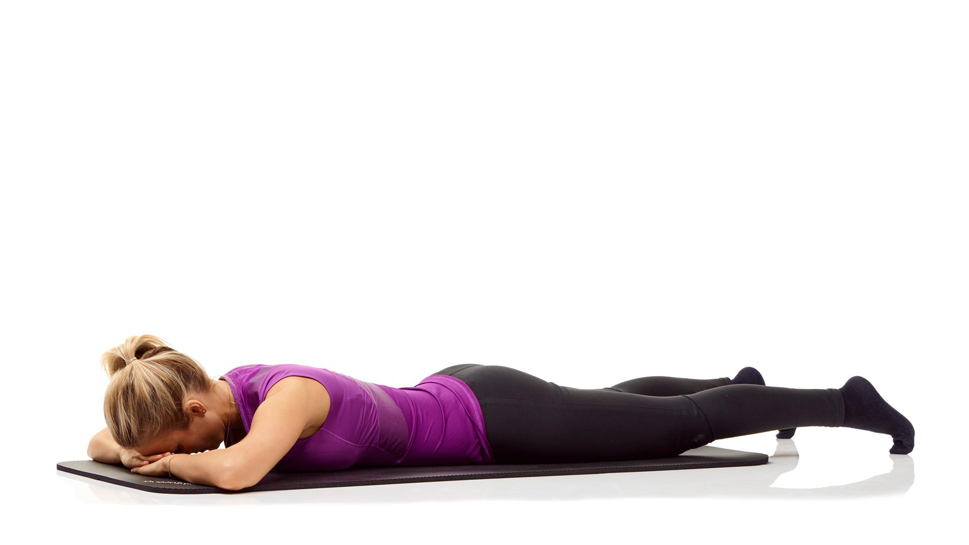 Stretch out face-down with your legs about hip-width apart. Your feet can point in or out—it doesn’t matter. Fold your arms and place your hands on opposite elbows, drawing your elbows in so that your shoulders and upper chest are off the floor. Rest your forehead on your folded arms. Close your eyes or soften your gaze and rest—relaxing your face, shoulders, abdomen, pelvis, legs, and feet.