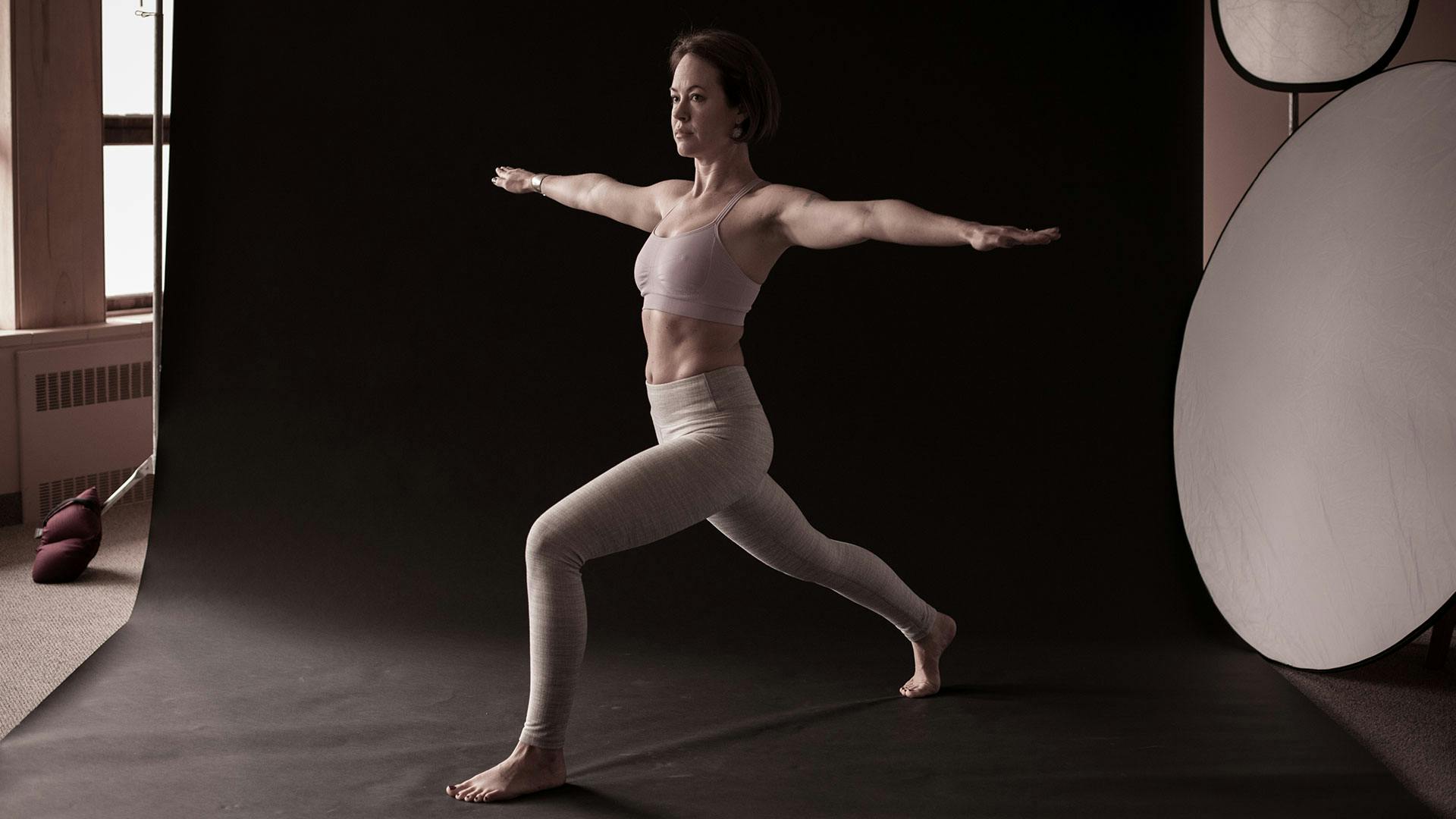 On an exhale, bend your right knee. Look down and make sure your right shin is vertical. Bring your right thighbone parallel to the floor so that the knee forms a right angle (if your hips are tight, less of an angle is fine, but don't take your knee beyond your ankle).