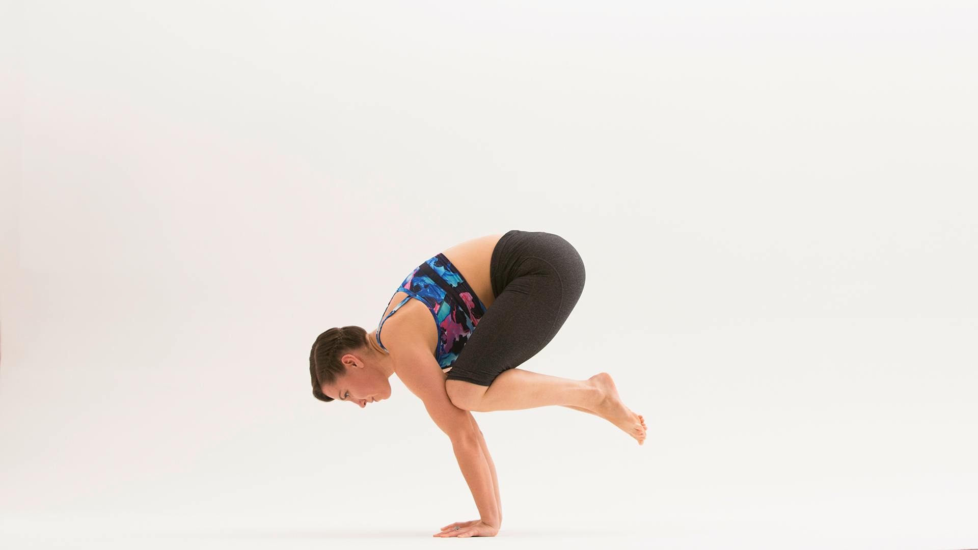 The hug of your inner thighs to your triceps (preferably skin-to-skin to prevent slipping) and strong engagement of your abdominals are key for maintaining straight arms in this elegant asana.