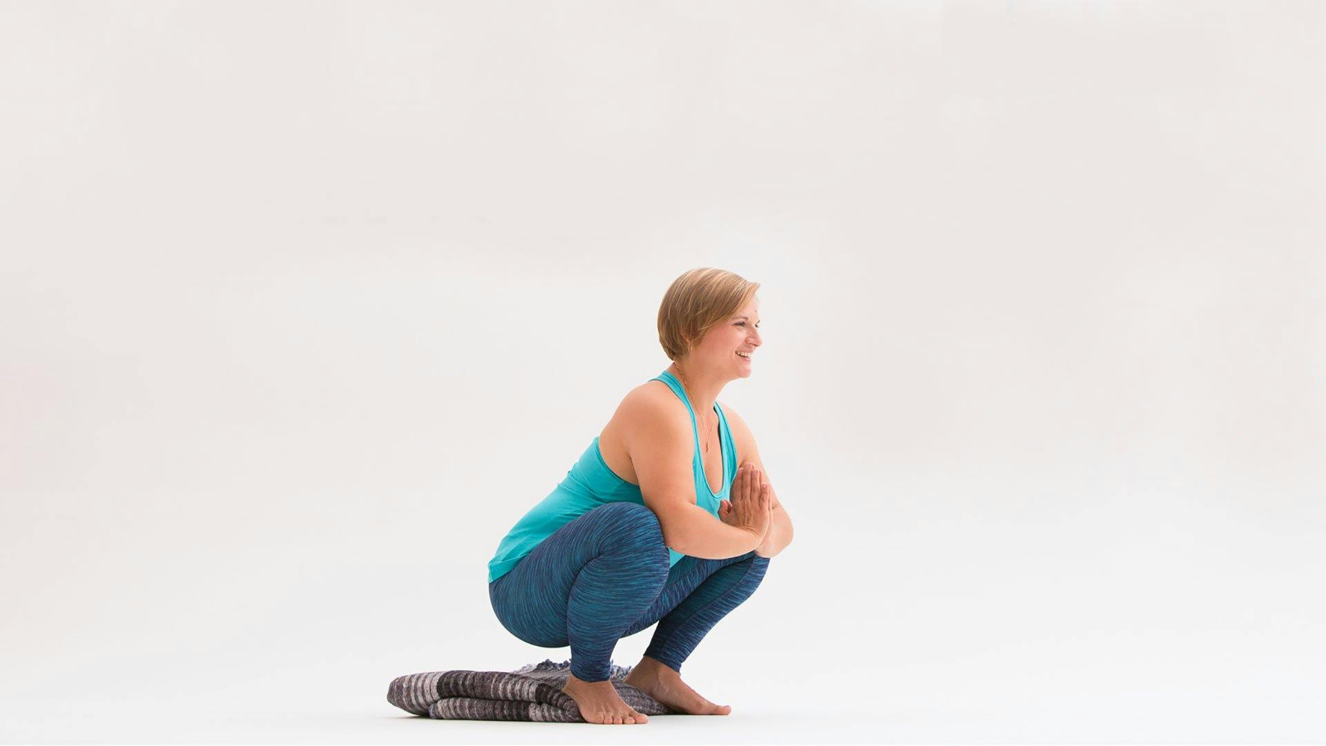 The easiest way to make this pose more accessible is to place support underneath the heels (such as a rolled up towel or blanket). If your heels are really close to the ground, try widening your feet a bit more and/or turning your toes out a little more, and see if that helps bring your heels down—but don’t force it, as your arches should remain lifted. The structure of your actual hip joint plays a role here too, so experiment with a wider or more narrow stance to find the ideal malasana width for you. There is no one-size-fits-all. However, do make sure your toes aren’t turning out too much, as this could cause the arches of your feet to collapse and your knees to fall in. Aim to keep your knees in line with the center of your ankles.