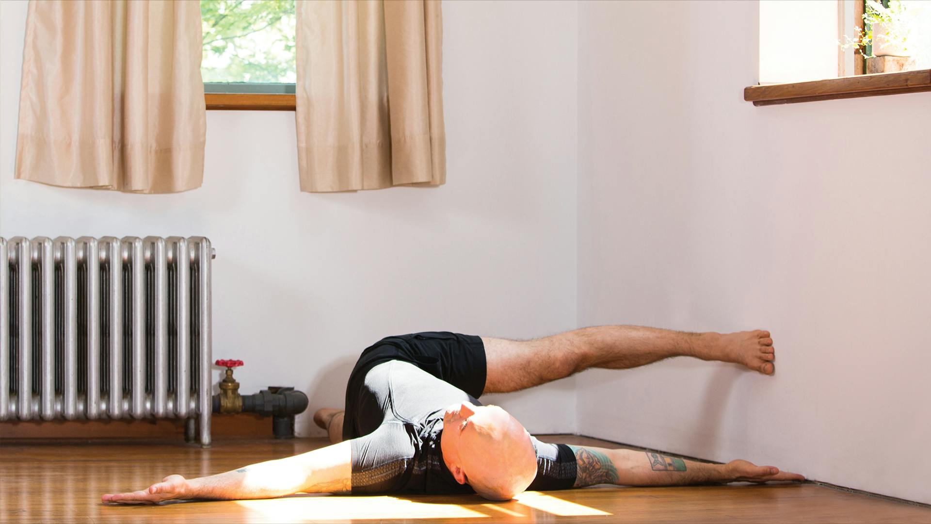 Stay for three to five minutes. To come out, slide your left foot back up the wall and uncross your legs. Shake your legs out, and then change sides.