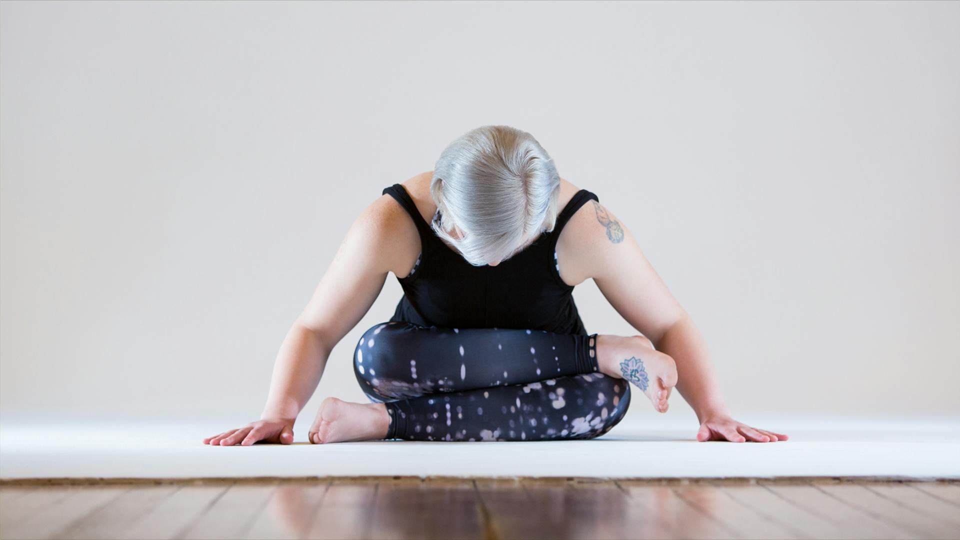 Square Fold: Four minutes (plus a one-minute counterpose on each side) From child’s pose, make your way into a comfortable cross-legged seated position. Then adjust your shins so that they are as parallel to the top edge of your mat, as is comfortable for you. See if you can tighten up the cross of your legs while maintaining a right angle in the knees.