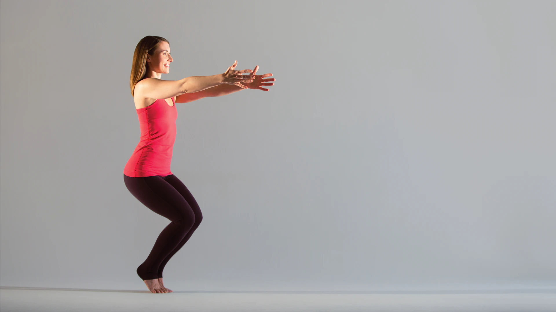 How to practice it: Stand with your big toes touching and heels slightly apart, or with your feet hip-width apart (whichever feels most stable for you). Shift your weight back into your heels as you bend your knees, and lower your body as if taking a seat in a chair. Make sure the center of your knees track in line with your second and third toes. Draw your lower belly in and lift your chest up, keeping your low ribs in. Reach your arms out in front of you at shoulder height, palms facing down (extending your arms forward for balance similar to how you might hold your ski poles!). Hold for 5 to 10 breaths.